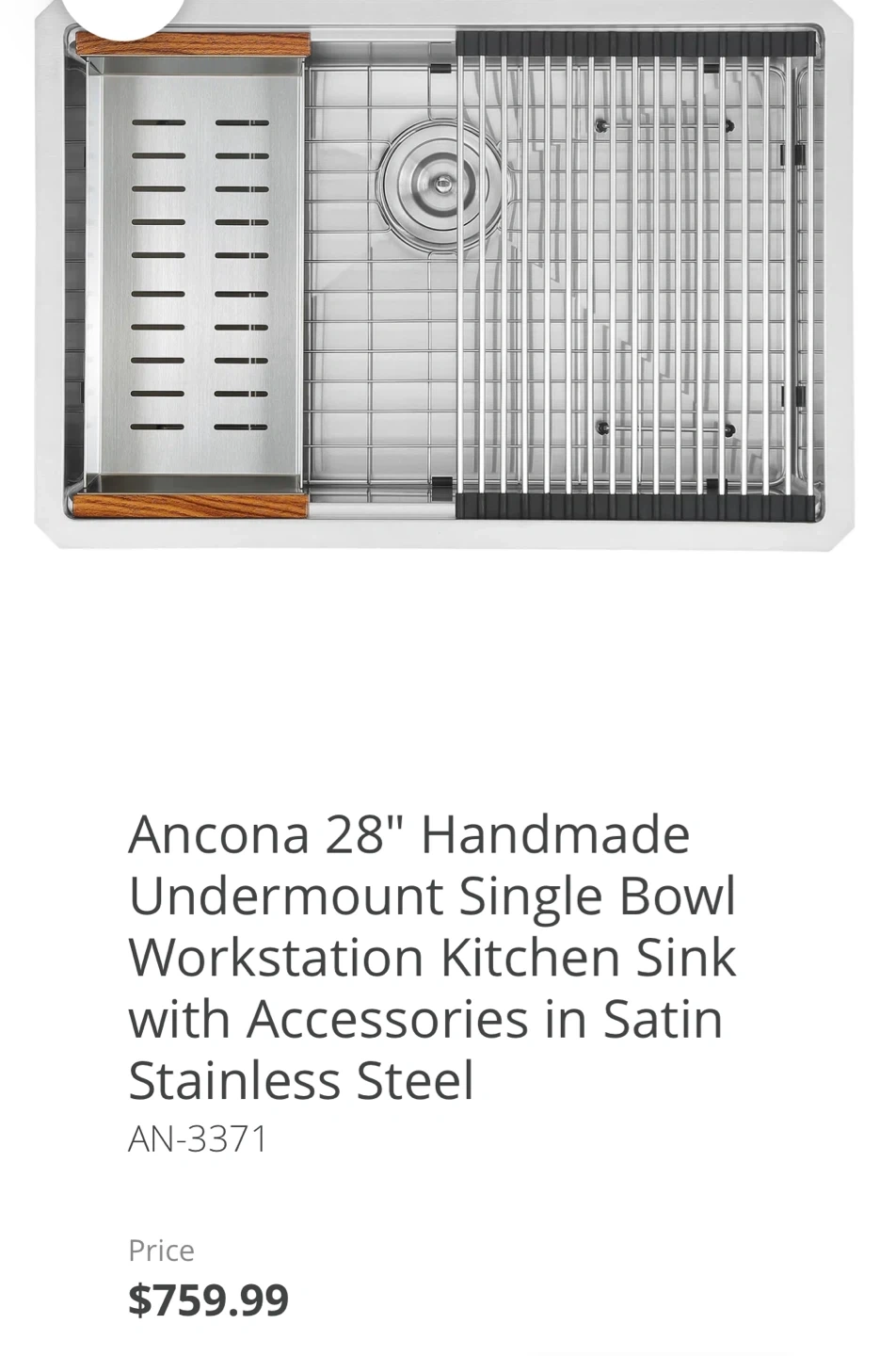 An Ancona 28" handmade undermount single bowl workstation kitchen sink. It's constructed from satin stainless steel and includes a wooden cutting board and a roll-up drying rack. This sink is designed to maximize kitchen workspace!
