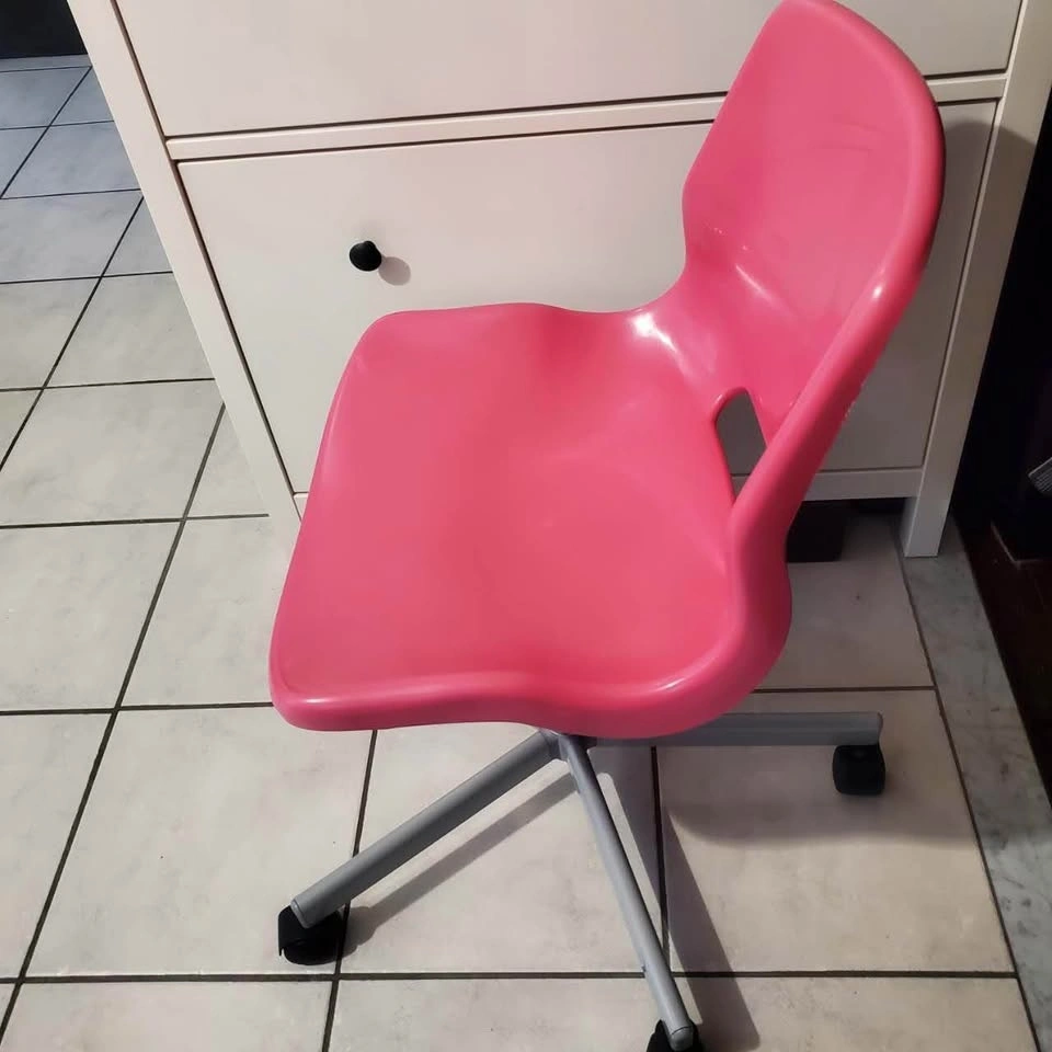Ikea SNILLE swivel height adjustable chair. It's perfect for a kid's room or any space that needs a pop of color. It is in good condition, but the roller wheels need to be lubricated as they don't turn easily. Priced accordingly. Features: Swivel base for easy movement, adjustable height to suit different users, compact design, ideal for small spaces.