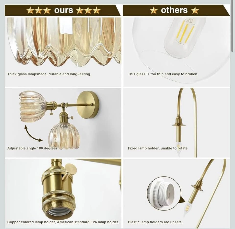 Vintage Wall Sconces with Amber Tulip Glass Lampshade, Indoor 180 Degree Adjust-able Wall Mount Lamp with Switch, Modern Gold Wall Lighting Fixture for Bedside Bedroom Hallway Bathroom 2 Pack