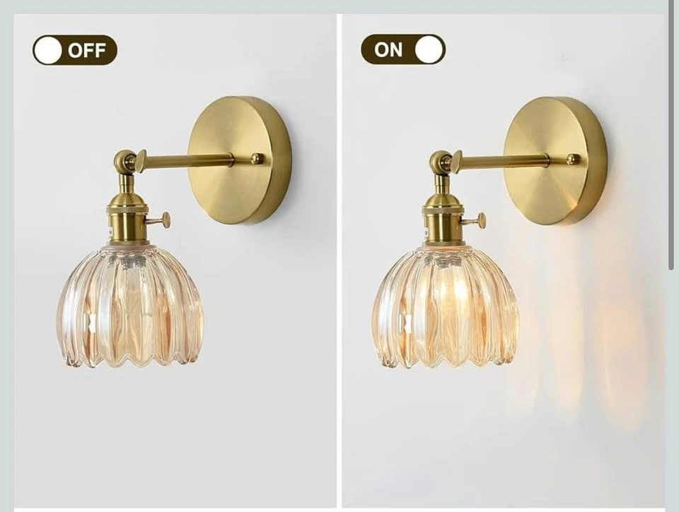 Vintage Wall Sconces with Amber Tulip Glass Lampshade, Indoor 180 Degree Adjust-able Wall Mount Lamp with Switch, Modern Gold Wall Lighting Fixture for Bedside Bedroom Hallway Bathroom 2 Pack