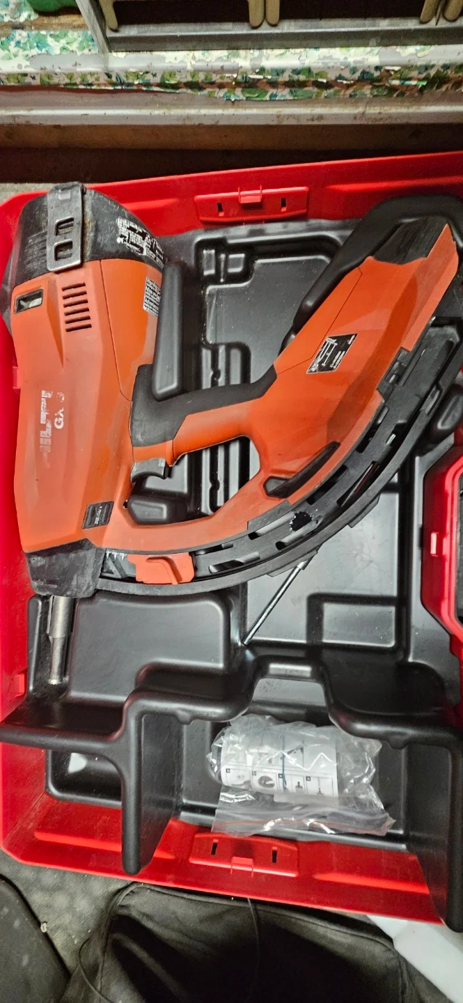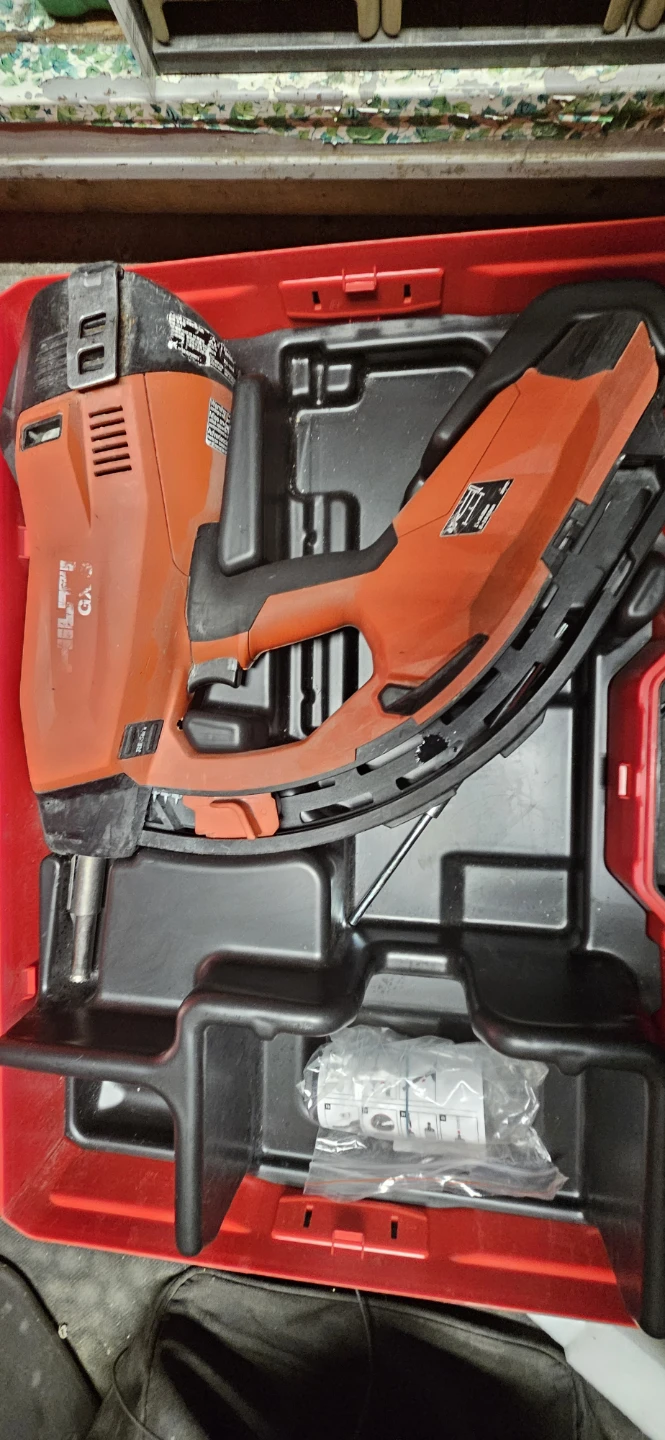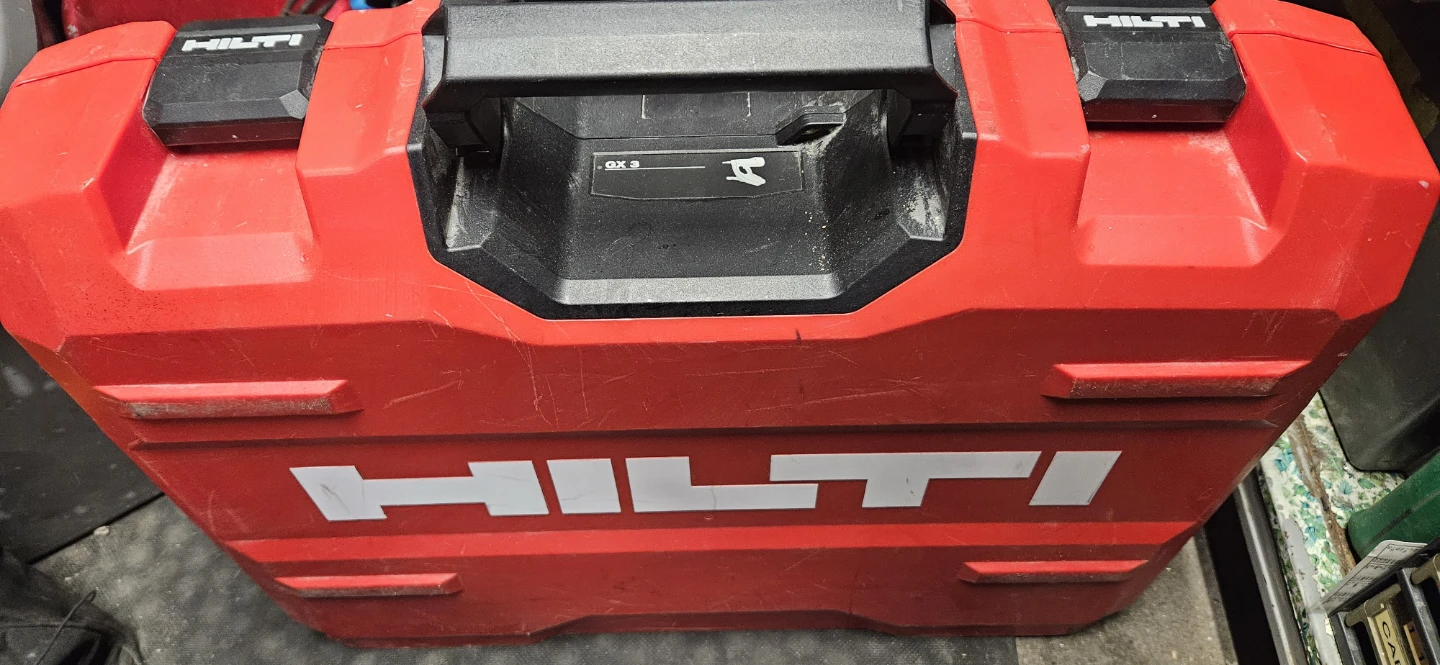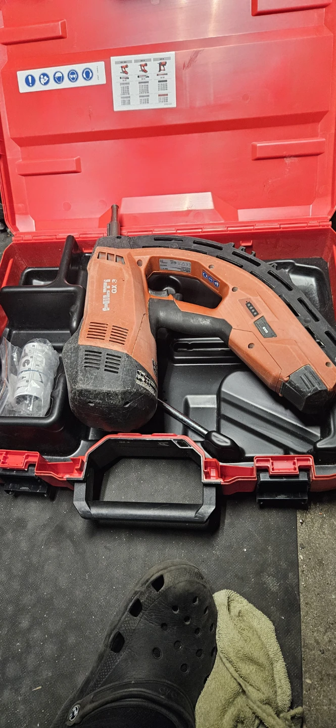 This is a Hilti GX 3 cordless gas nailer, complete with its original case. It's designed for quick and efficient fastening. This tool is great for construction professionals needing a reliable nailing solution on site.