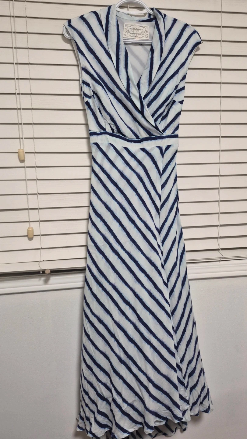 A stylish Piaza Marti sleeveless maxi dress with a navy and white diagonal stripe pattern. It features a flattering faux-wrap V-neckline and a cinched waist. Perfect for warm weather occasions!
