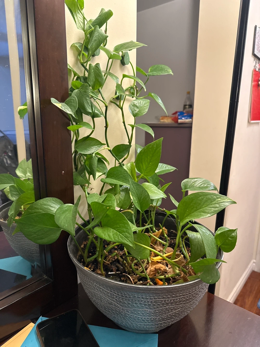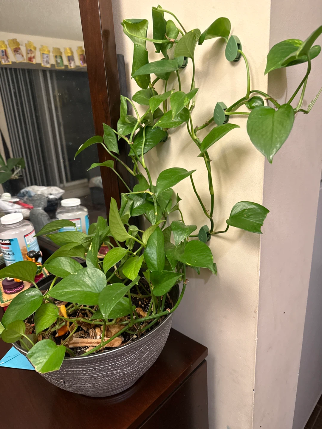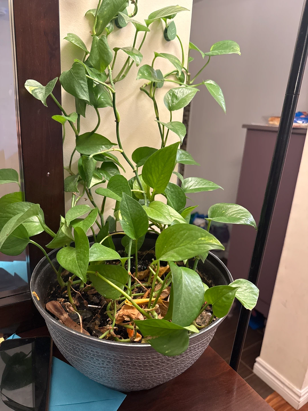 Selling a healthy golden pothos plant in a decorative pot! It's a beautiful and easy-to-care-for houseplant that will add a touch of green to any space