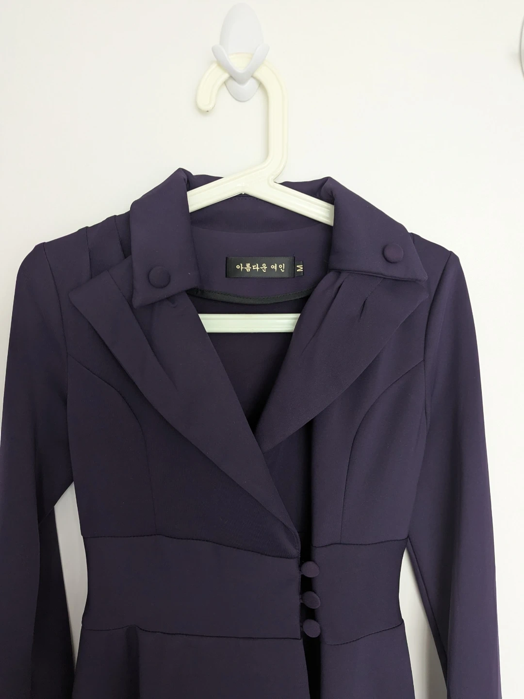 This is a stylish purple blazer dress with a flattering fit and button details. It's made from a comfortable fabric suitable for various occasions. The dress features a notched lapel and a cinched waist, offering a sophisticated silhouette. Size medium.