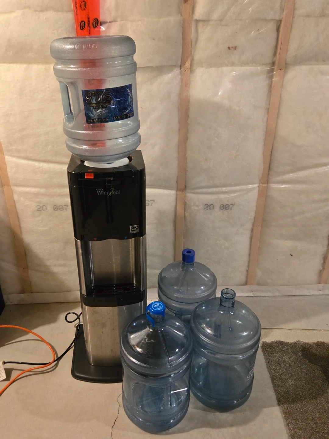 This is a Whirlpool water cooler dispenser with 4 empty water jugs. It features hot and cold water dispensing. Perfect for keeping hydrated at home or in the office!