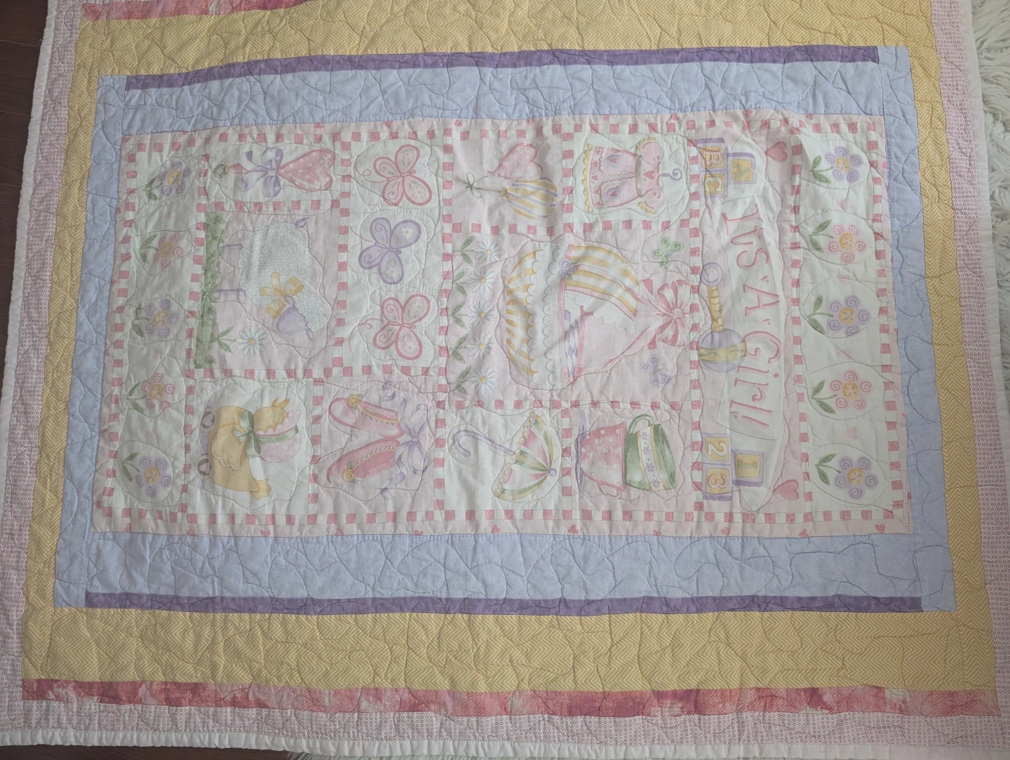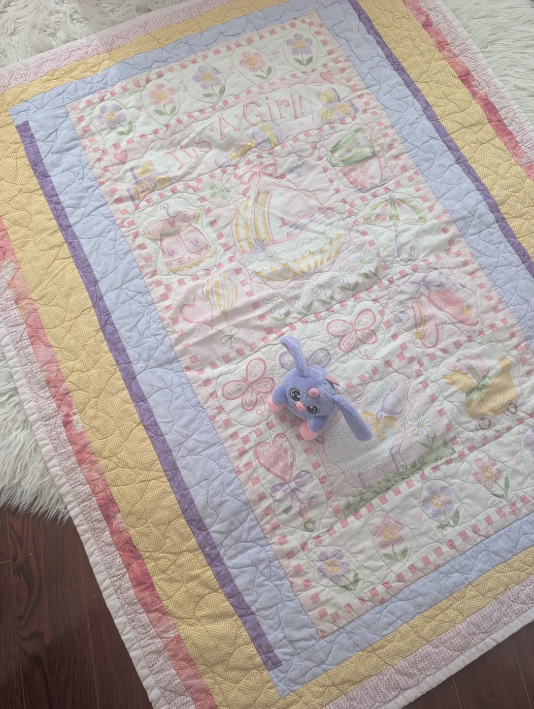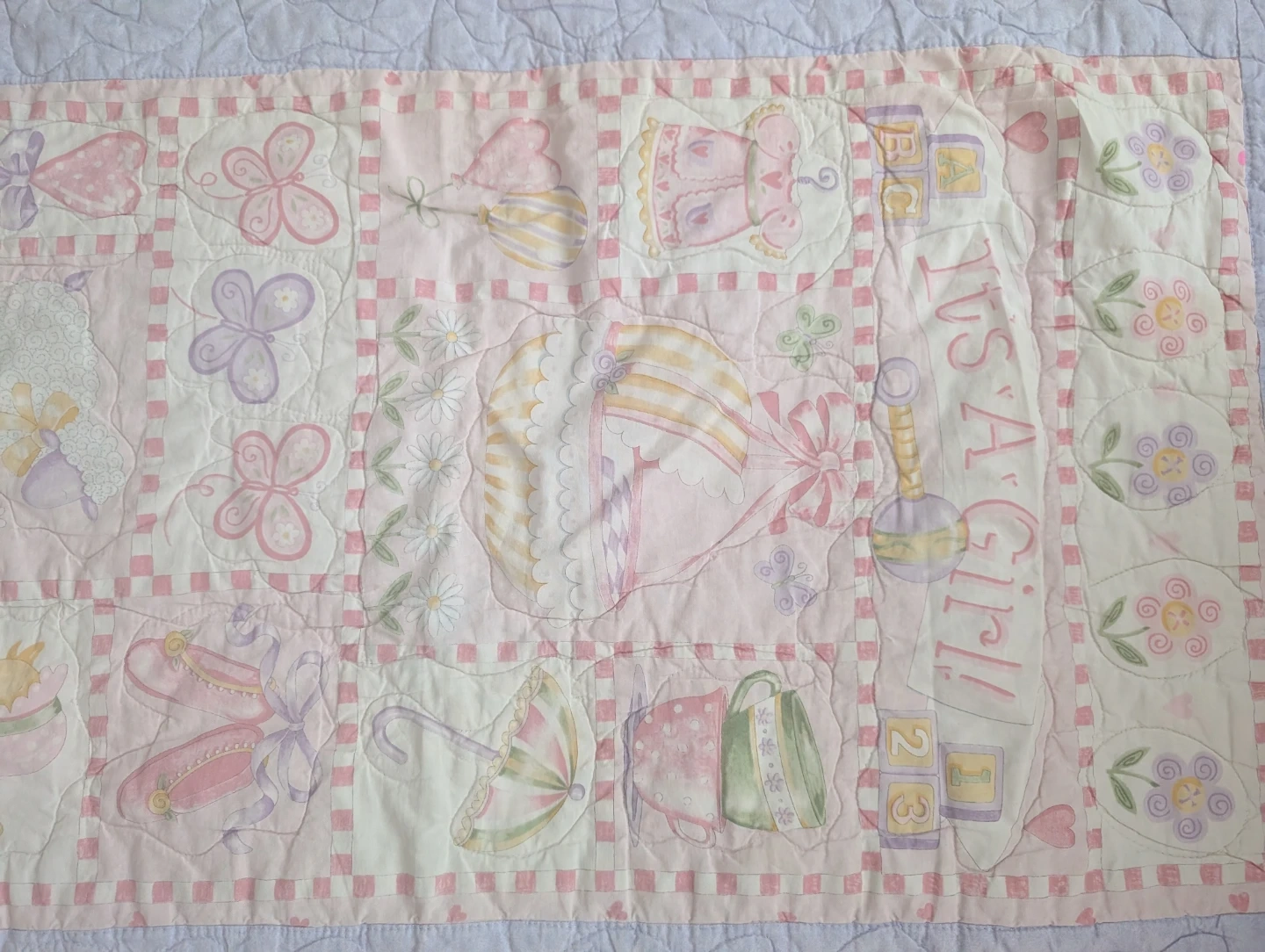 This sweet baby quilt is perfect for a nursery. It features a charming "It's A Girl!" theme with butterflies and baby clothing motifs. Made with soft fabric for comfort.