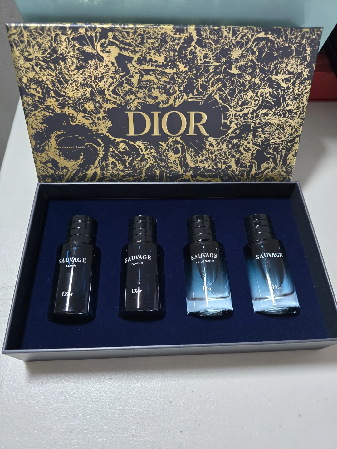 This set includes four Dior Sauvage fragrances. The box is decorated with a gold and navy pattern. Contains Sauvage Elixir, Parfum, Eau de Parfum, and Eau de Toilette.