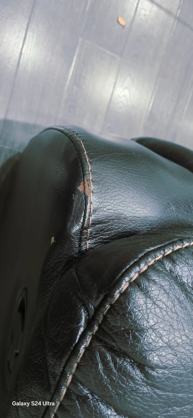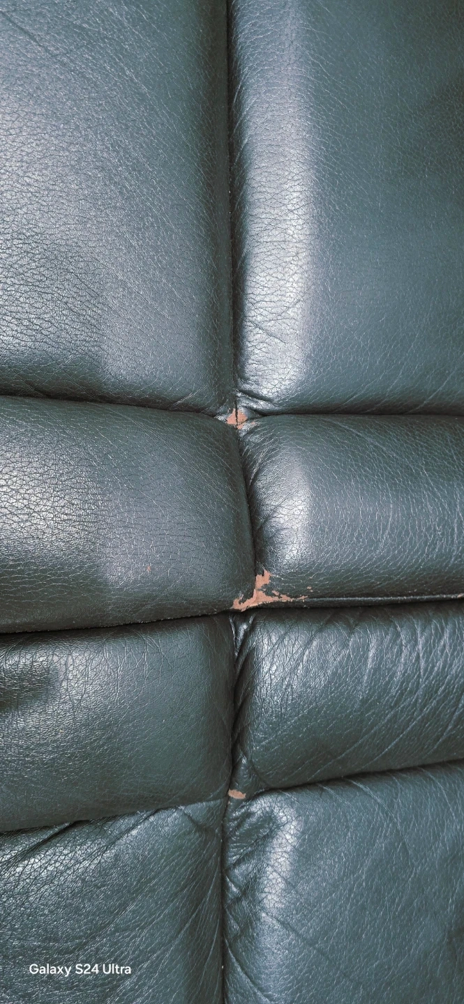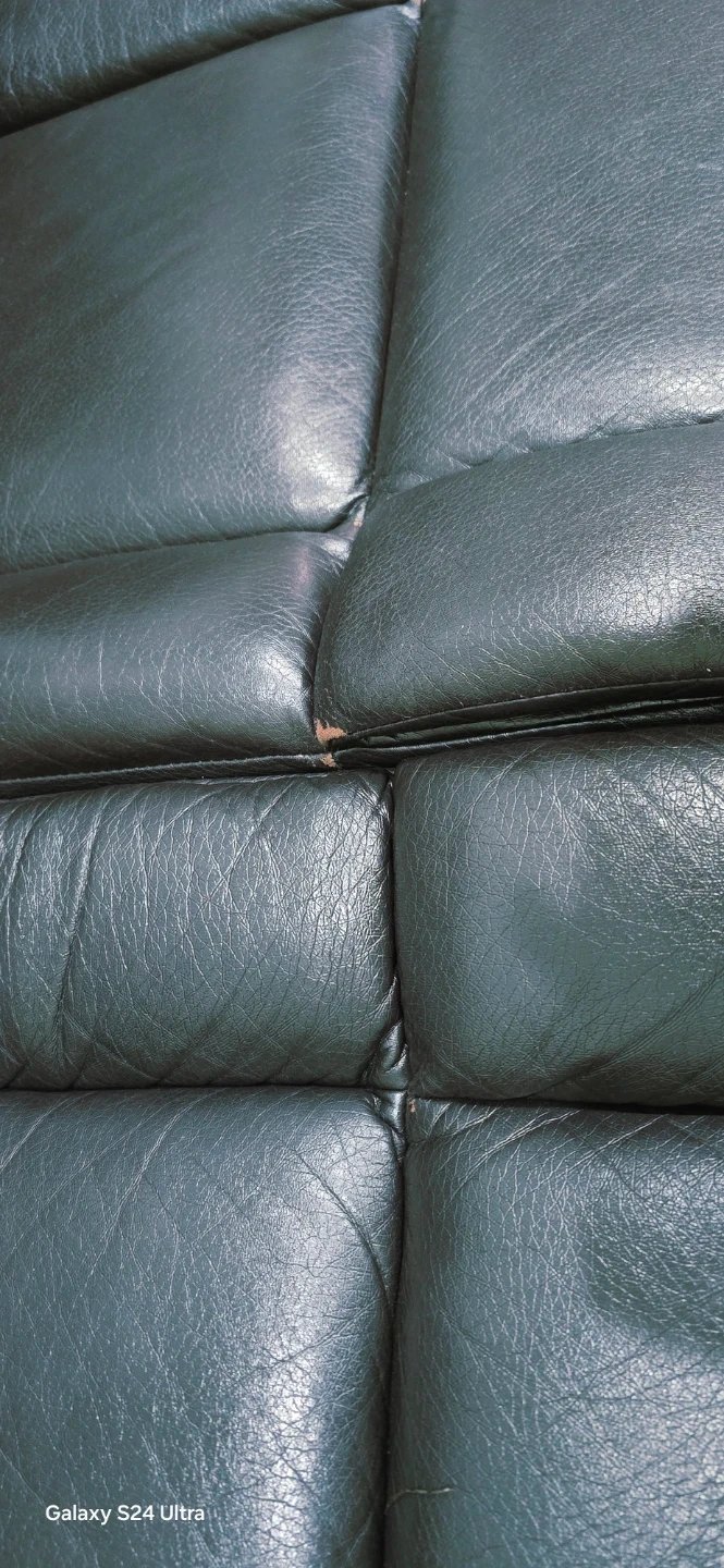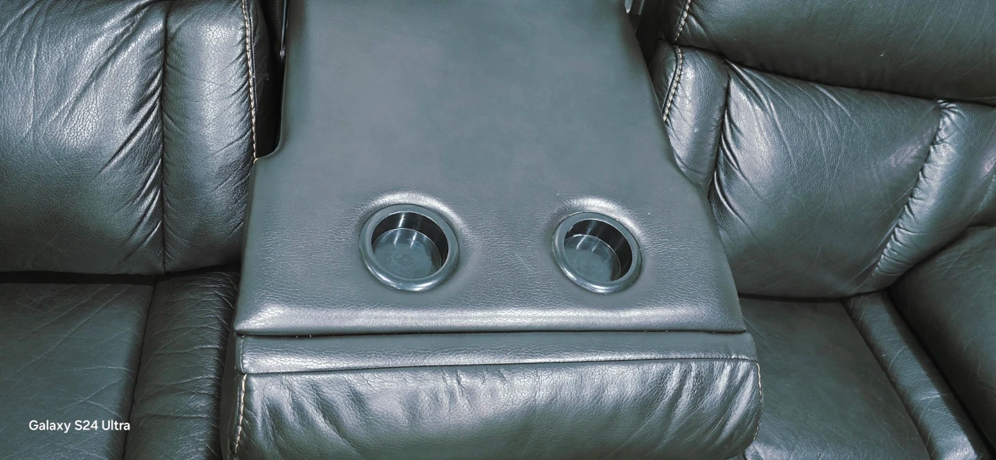 3+2 seater reclining sofa in a black leather material. It features a centre console with two cup holders and reclining seats on both ends. Some minor wear and tear on the leather is visible. Perfect for a home theatre setup!