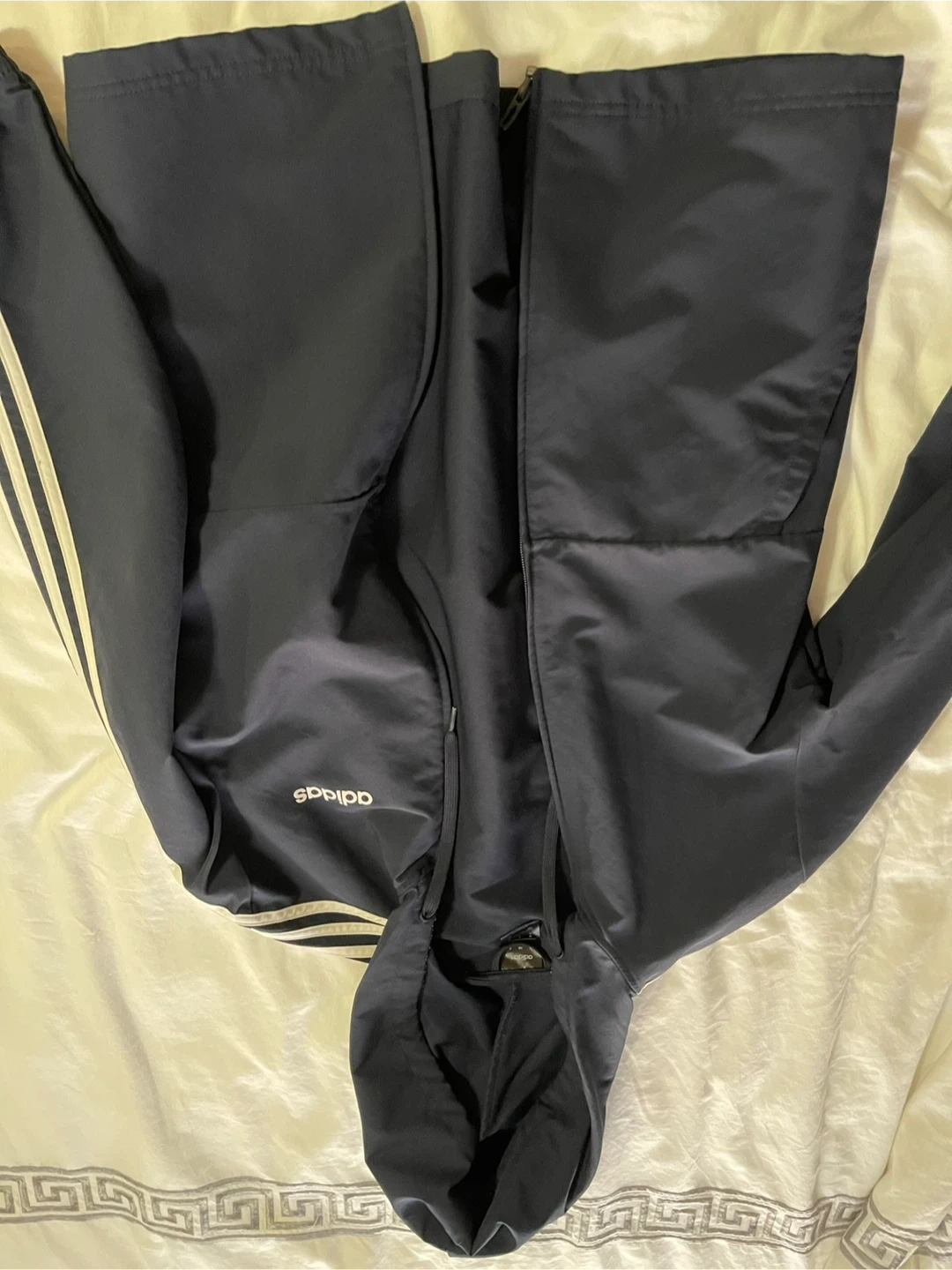 This Adidas track jacket comes in a navy blue colour and features the classic three stripes. It's got a hood for extra coverage. Made in Vietnam. Size is S.