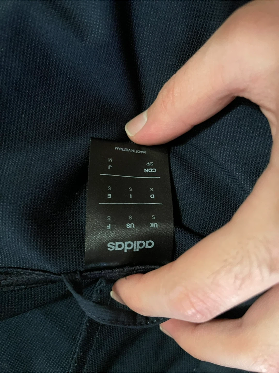 This Adidas track jacket comes in a navy blue colour and features the classic three stripes. It's got a hood for extra coverage. Made in Vietnam. Size is S.