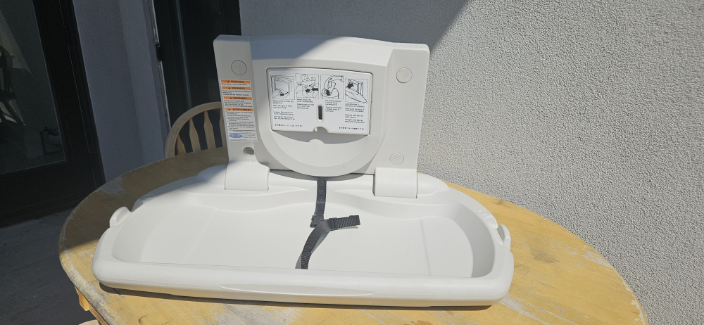 This changing station folds up for storage, making it easy to move around the house and for travel. It is in great condition and would be a great addition to your baby registry. Wall mounted.