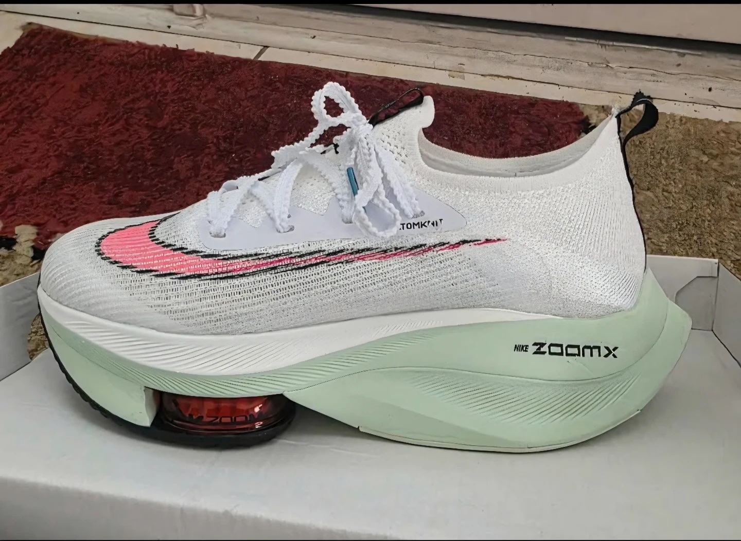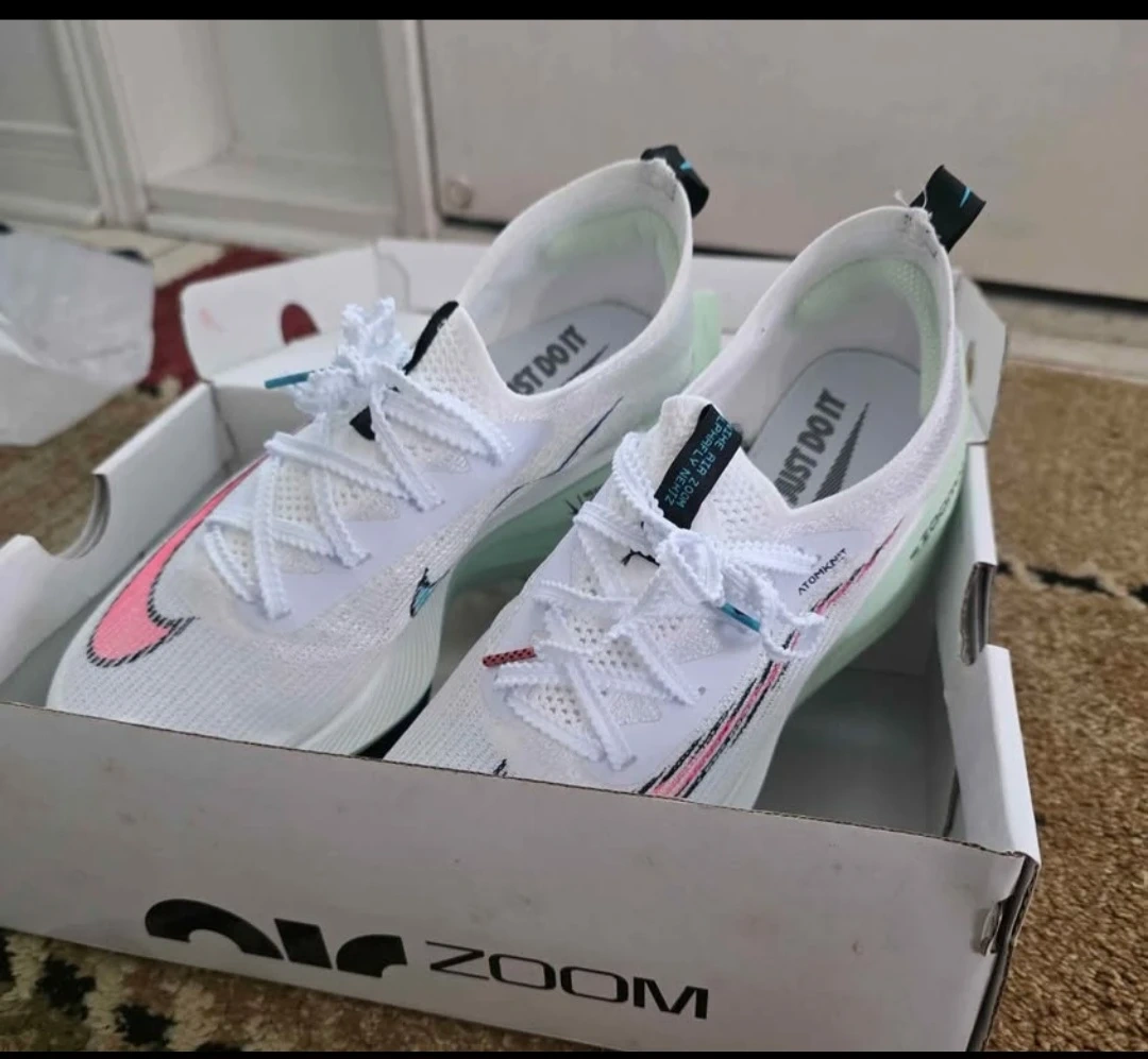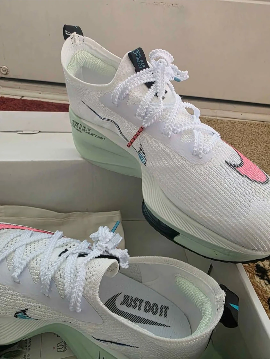 Nike Air ZoomX running shoes in white with pink accents. These shoes are designed for performance. They're built with a breathable knit upper and responsive cushioning. Ideal for runners seeking speed and comfort! Never used, as the wrong size was purchaed. 7.5