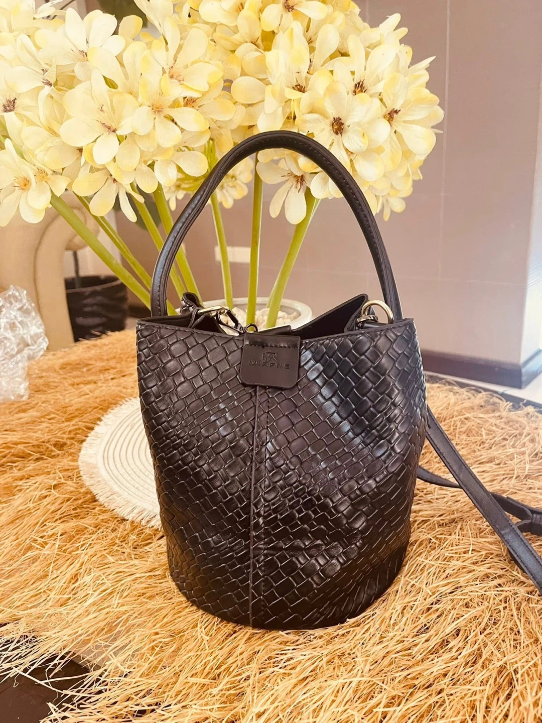 This MIRFENE bucket bag has a woven leather exterior. It comes with a shoulder strap for versatile carrying options. A stylish accessory for day or evening use!