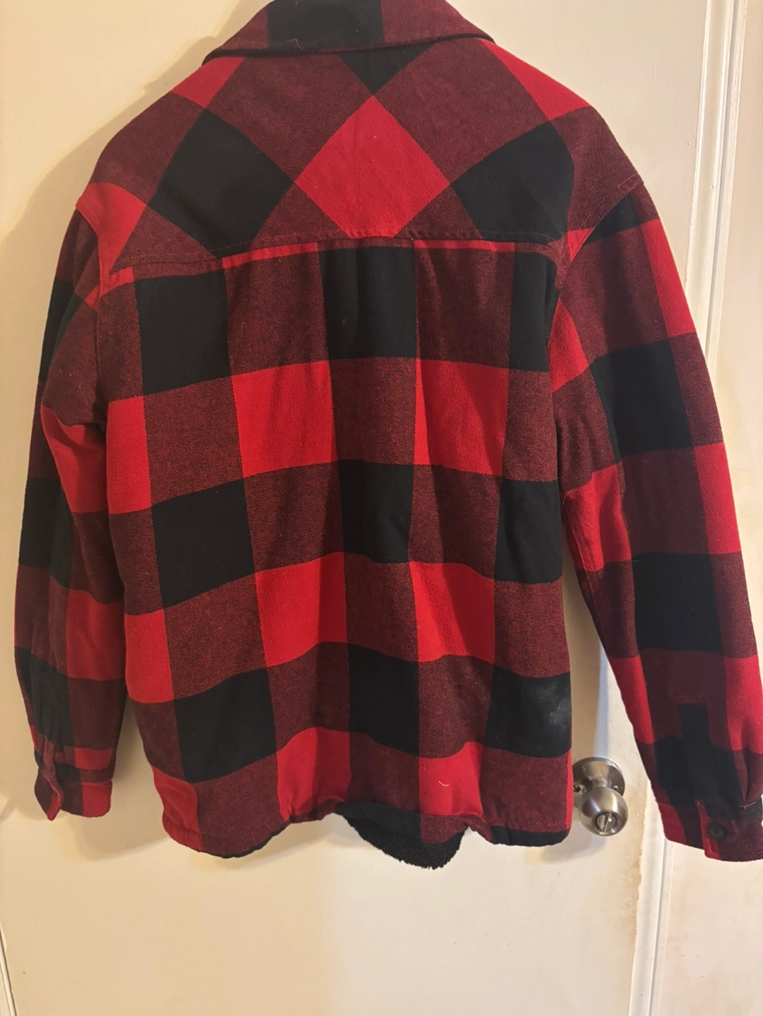 Warm flannel shirt jacket. Red and black buffalo check pattern. Button closure. Two chest pockets. Fleece lining. Size medium.