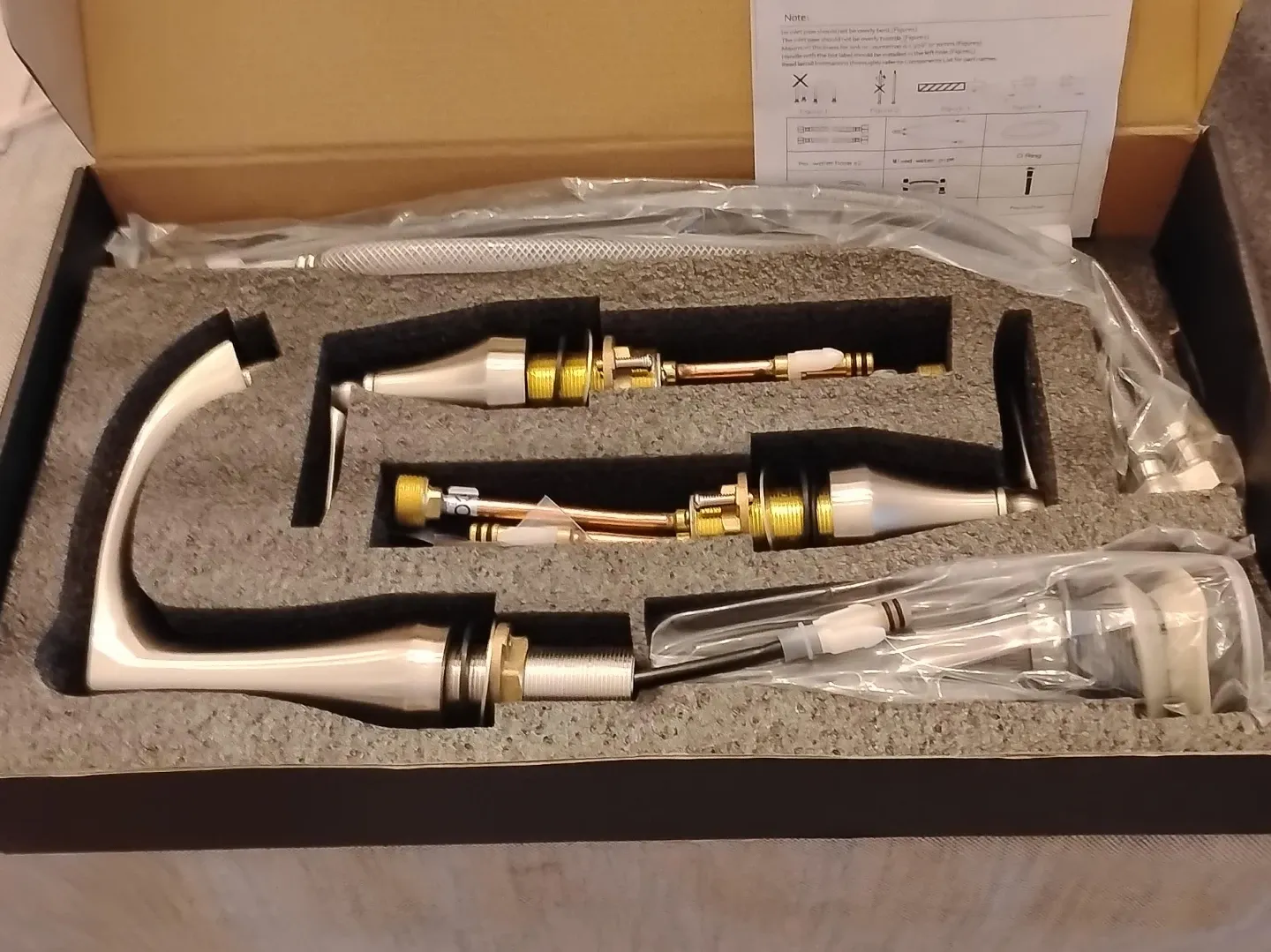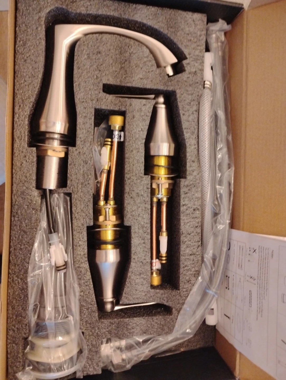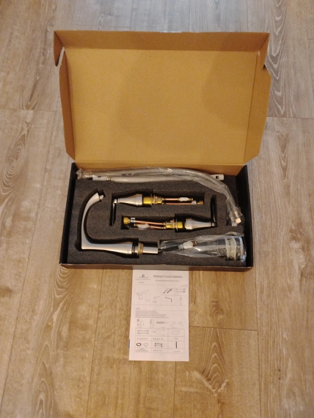 This is a new bathroom faucet set, still in its original box. It comes with all the necessary components for installation. The faucet appears to be made of brushed nickel.