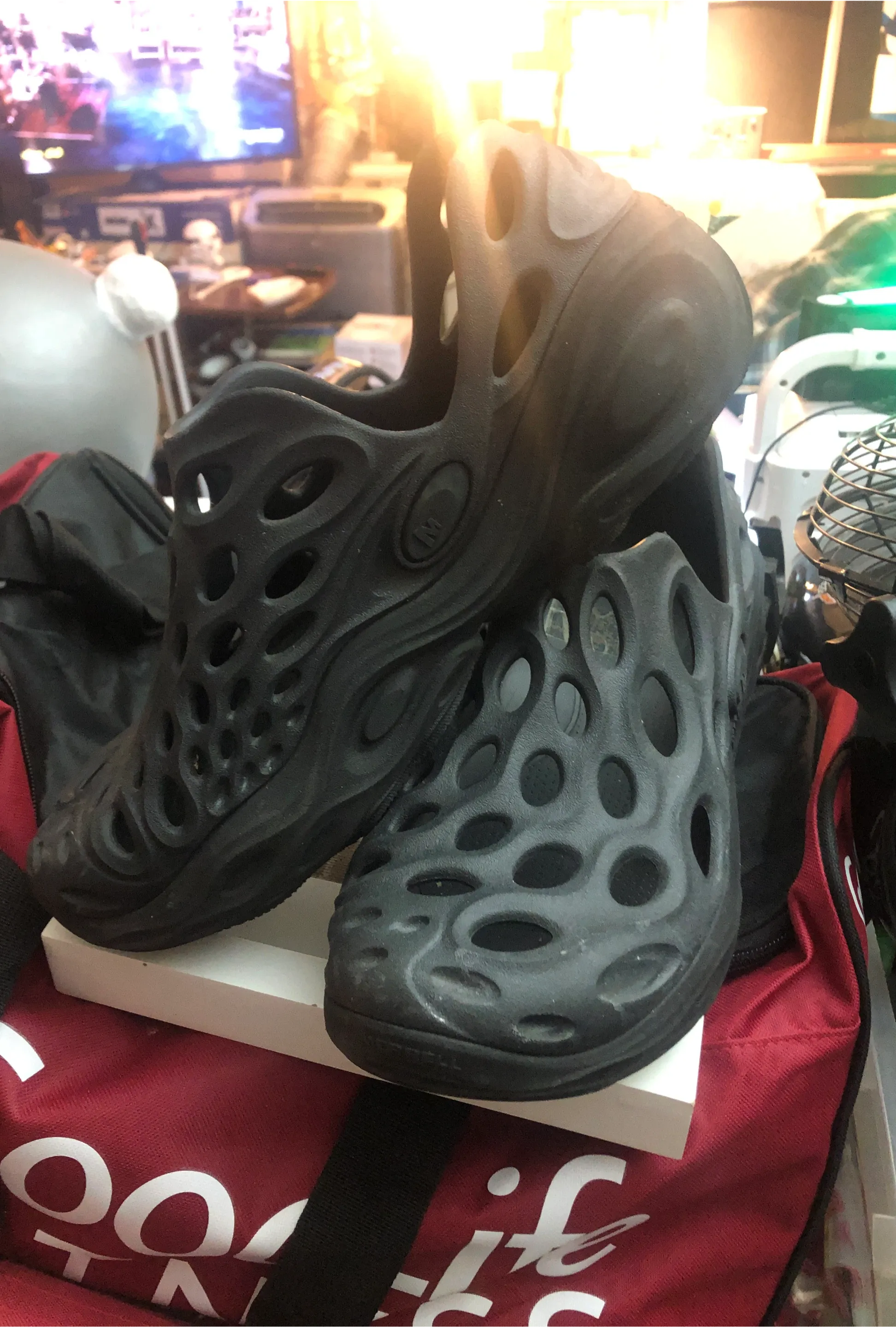 These Merrell Hydro Mocs are black and made from durable EVA foam. They're perfect for water activities or casual wear. They feature a unique, caged design for breathability and quick drainage.