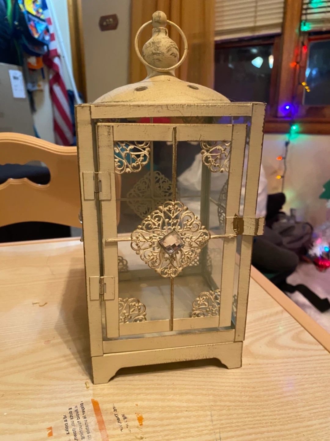 I'm selling a decorative lantern with a metal frame and glass panels. It has an intricate design and a vintage look. Perfect for adding a touch of charm to any room!