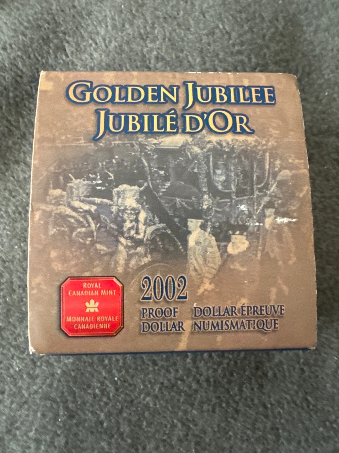 This is a 2002 Canada Proof Silver Dollar coin celebrating the Golden Jubilee. It features Queen Elizabeth II and a carriage on the reverse. It's presented in its original green velvet case with a certificate of authenticity. Made of silver.