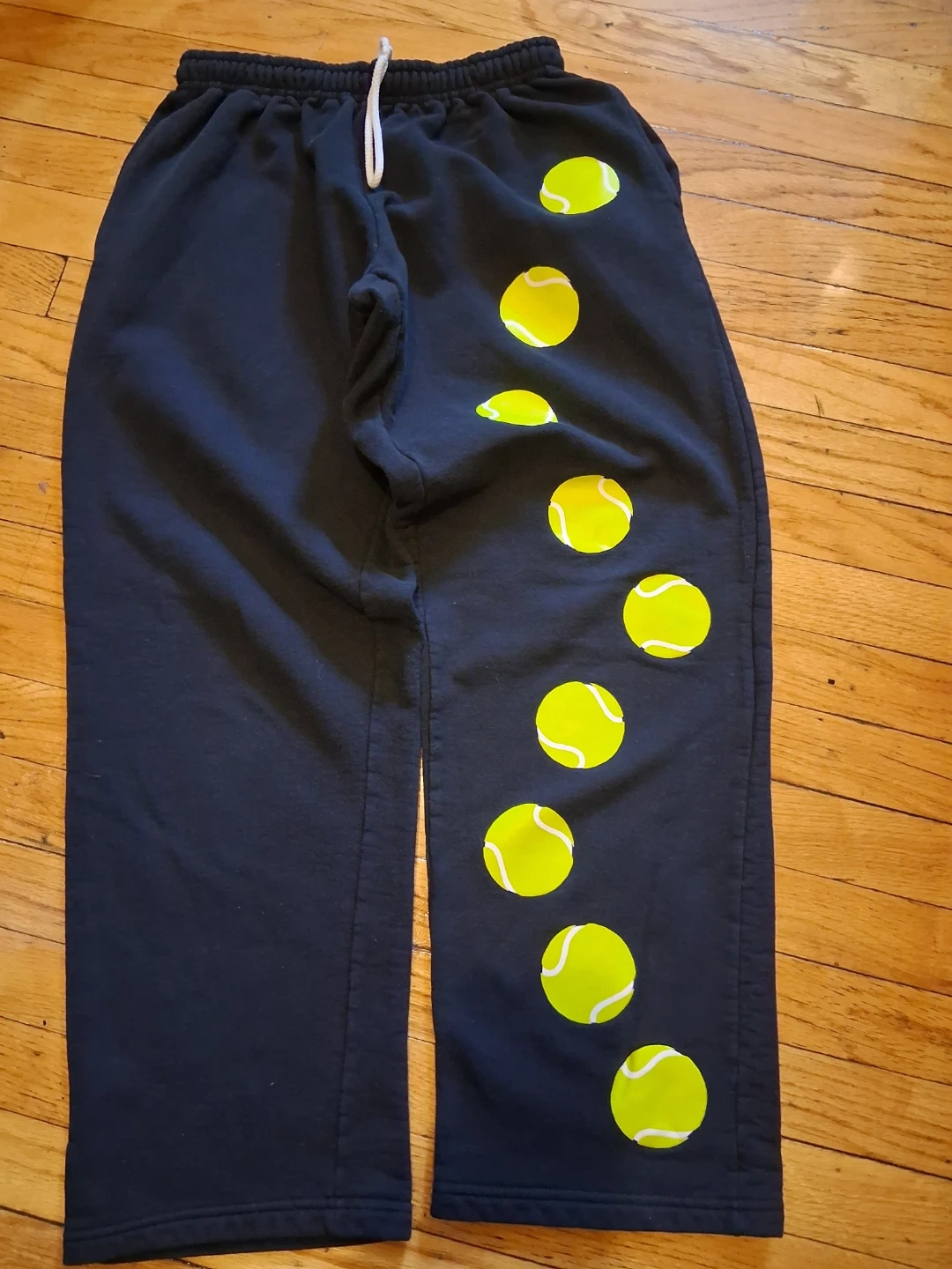 Comfortable black sweatpants with a fun graphic design. Features a printed tennis ball pattern down one leg and paw prints on the back. Made from a Gildan Ultra Blend fabric.
