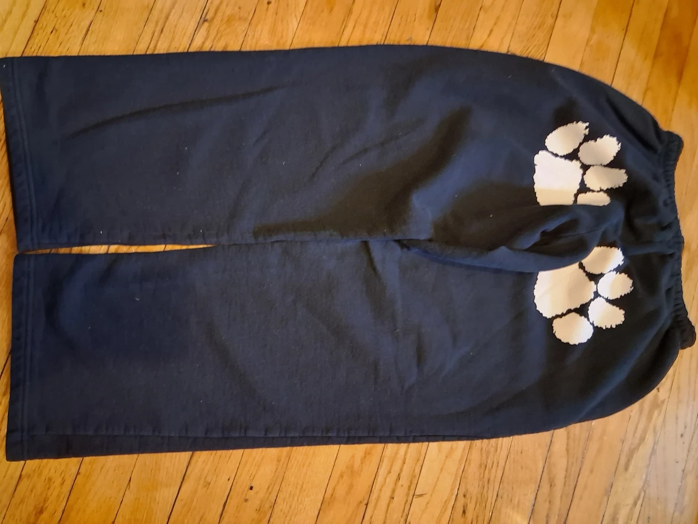 Comfortable black sweatpants with a fun graphic design. Features a printed tennis ball pattern down one leg and paw prints on the back. Made from a Gildan Ultra Blend fabric.