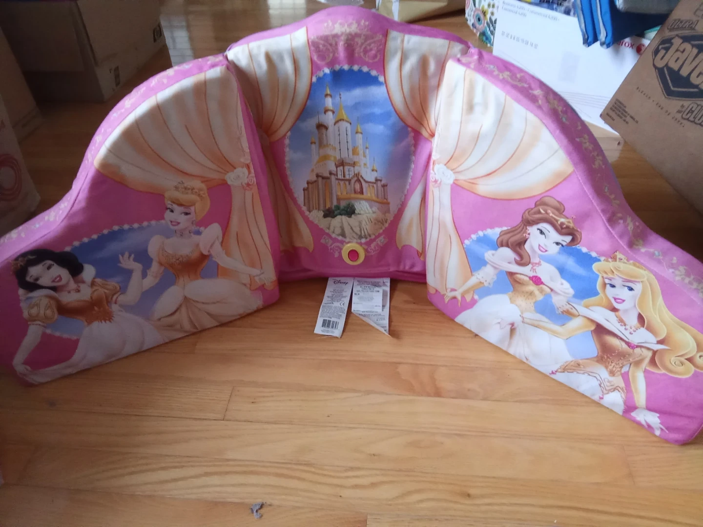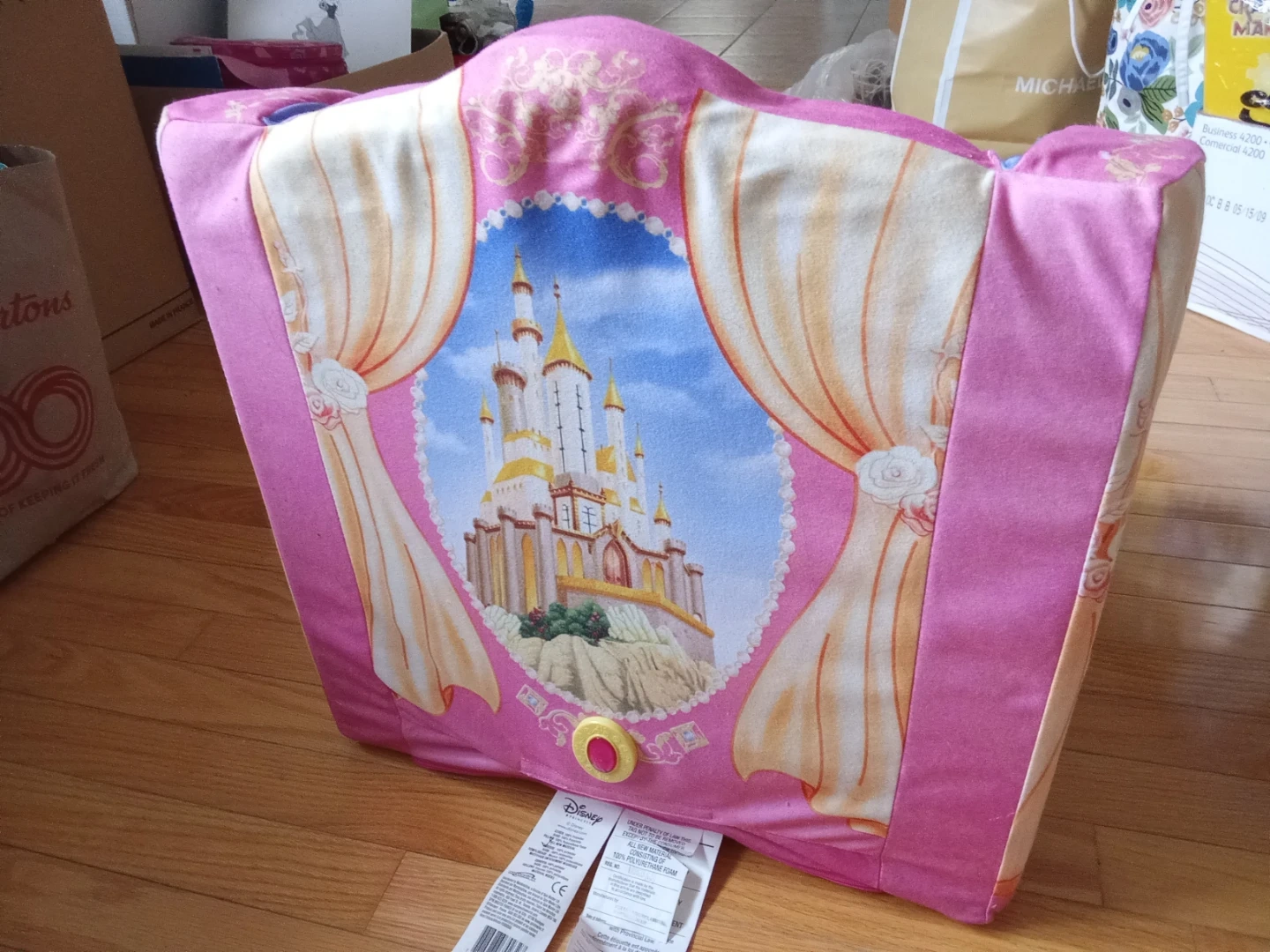 This is a pink child's carriage armchair featuring Disney Princesses like Cinderella, Belle, and Aurora. It has a castle graphic on the front with drapes. It's made of soft fabric, perfect for a child's room.