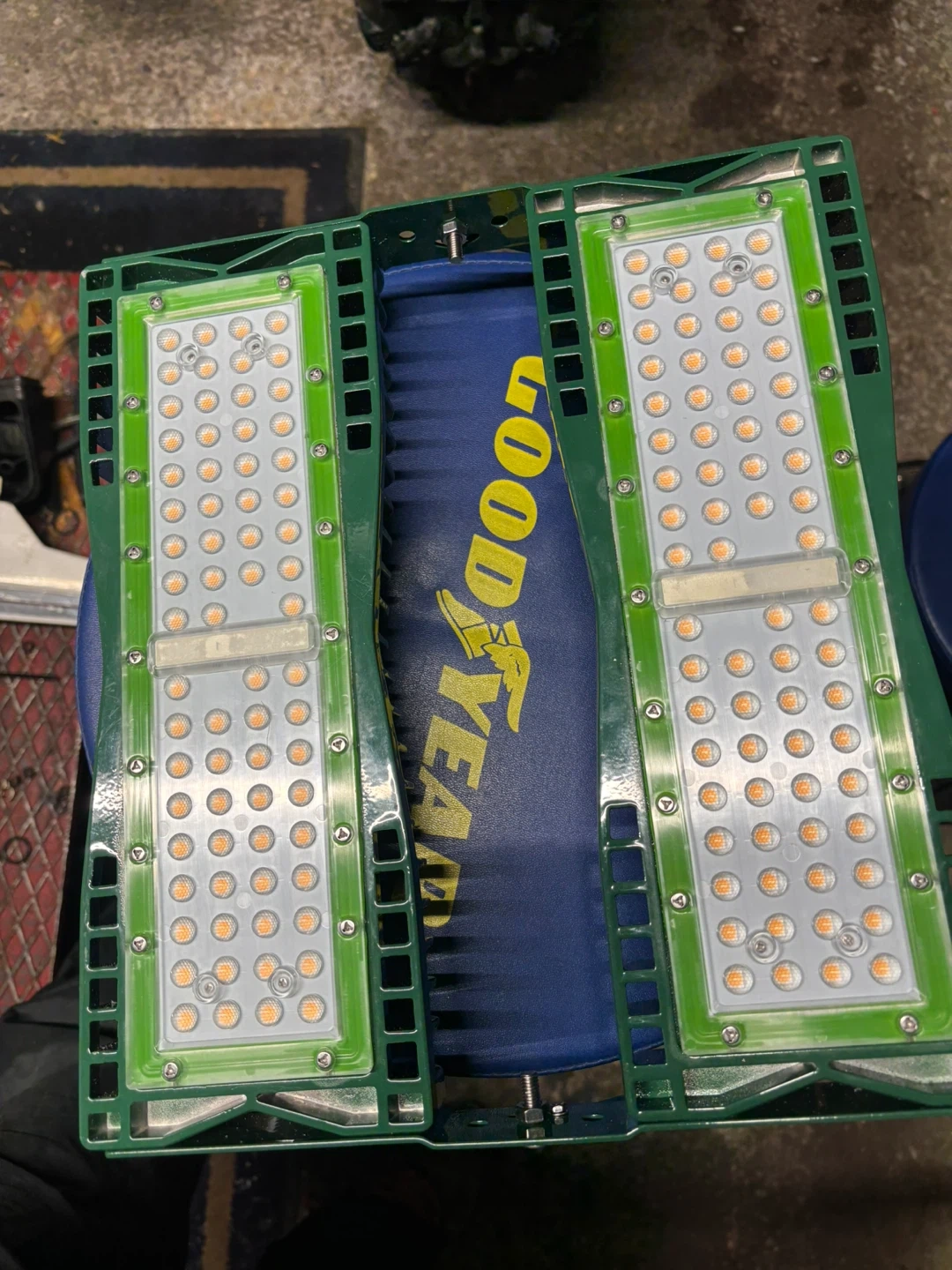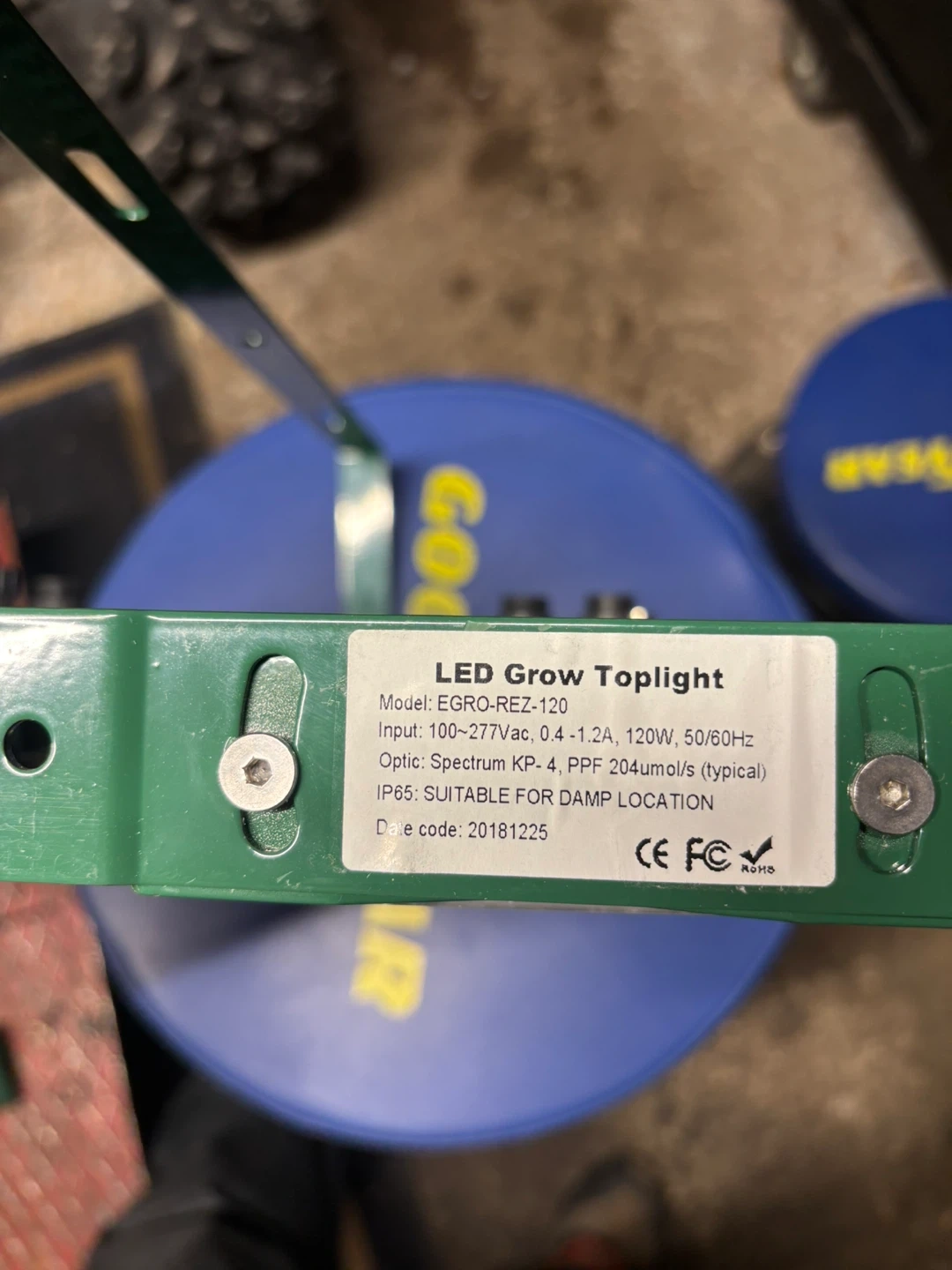This is an LED Grow Toplight, model EGKO-REZ-120. It operates at 100-277Vac and draws 0.4-1.2A, 120W. The spectrum is KP-4 with PPF 204umols/s. It's IP65 rated and suitable for damp locations. The manufacturing date code is 20181225. This light would be useful for indoor plant cultivation.