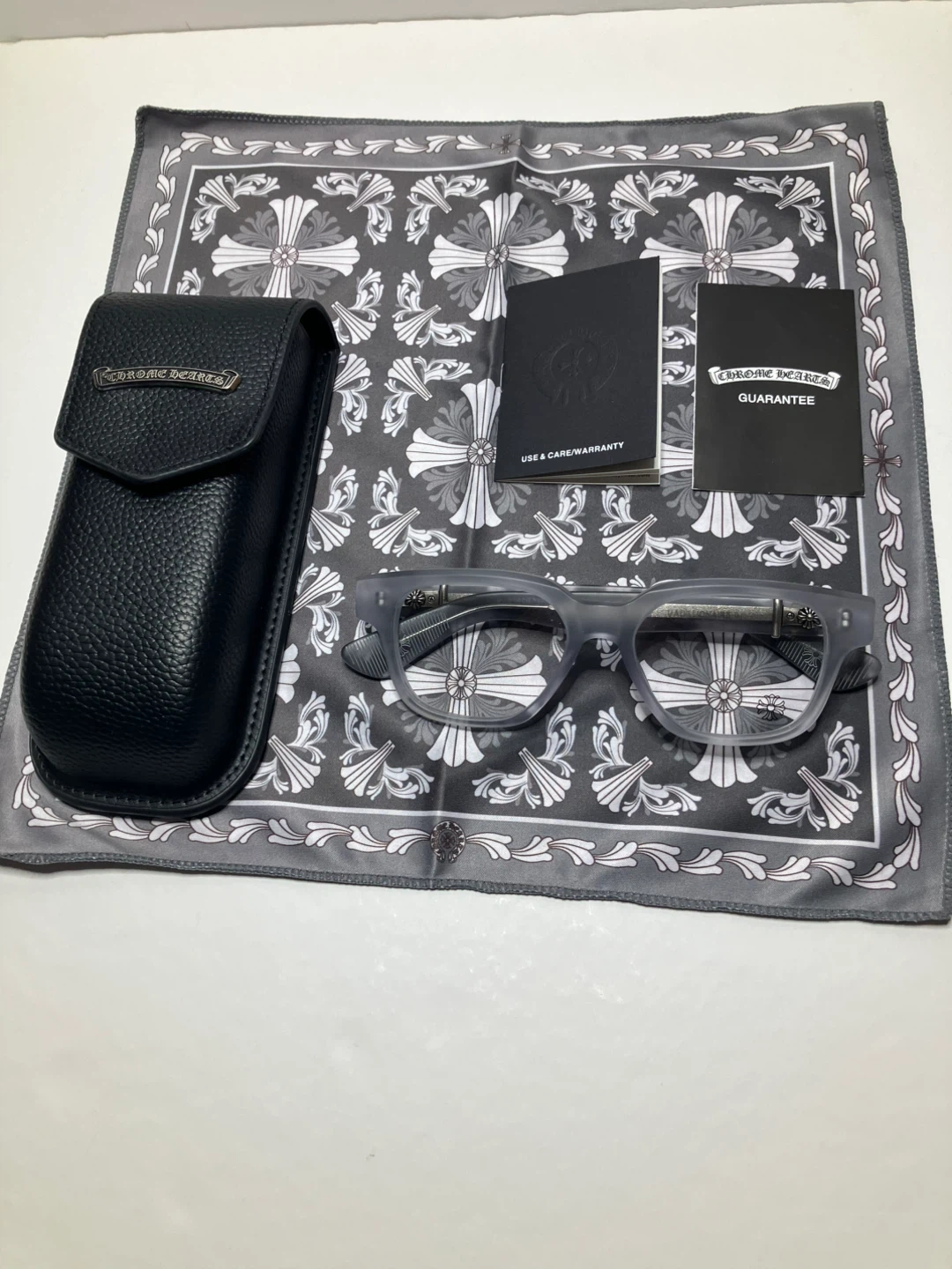 Chrome Hearts glasses with a matte grey acetate frame. These spectacles are made in Japan and include the original case, cleaning cloth, and guarantee card. It's a stylish accessory for everyday wear.