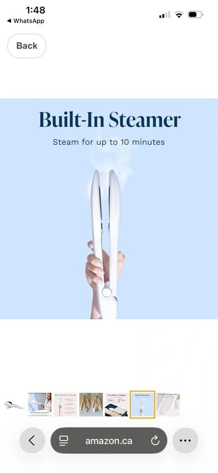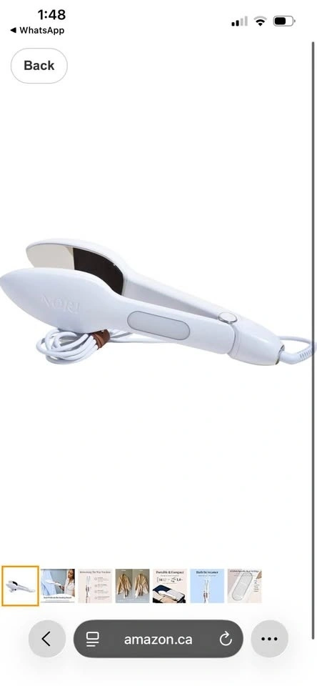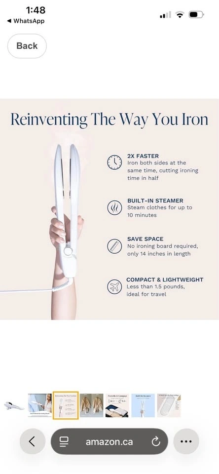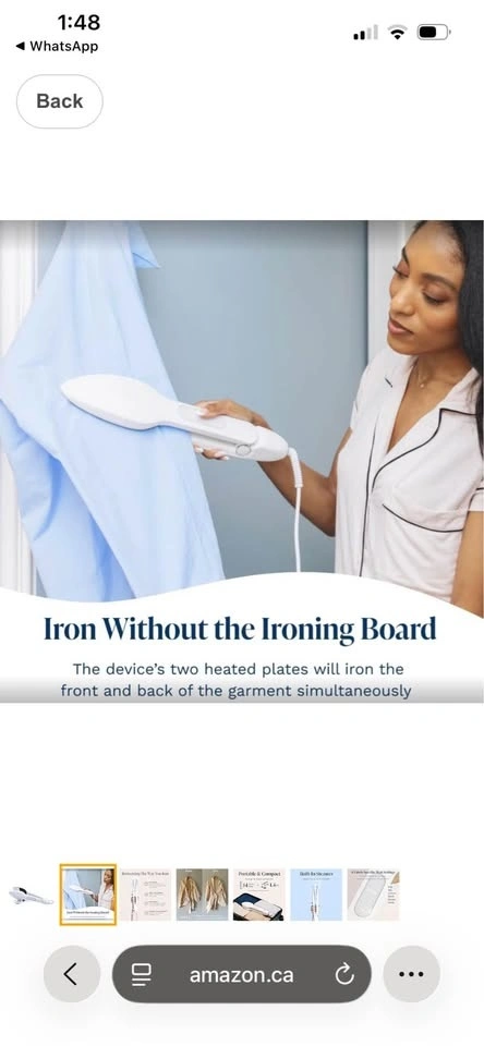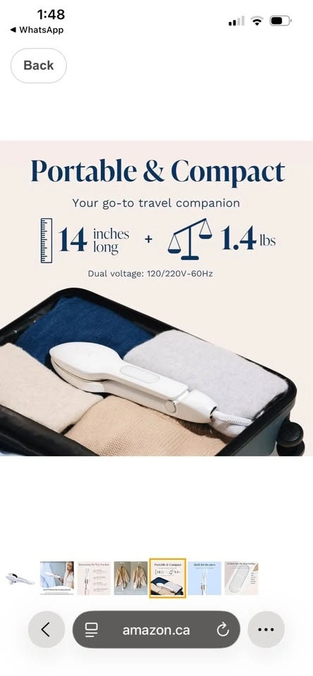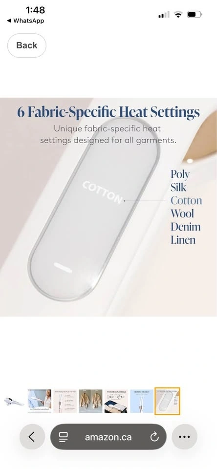 Compact iron and steamer for clothes. Removes wrinkles. Hand-held device, portable for travel, and easy to use. Features 6 fabric settings. White color, 14'' cord. Feel free to message if you have any questions!