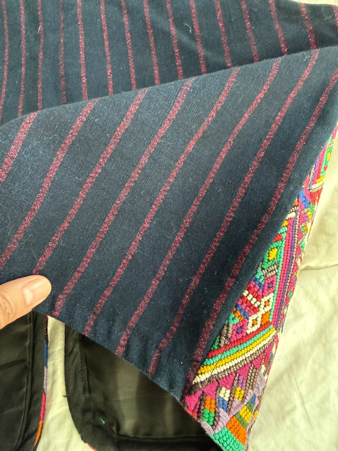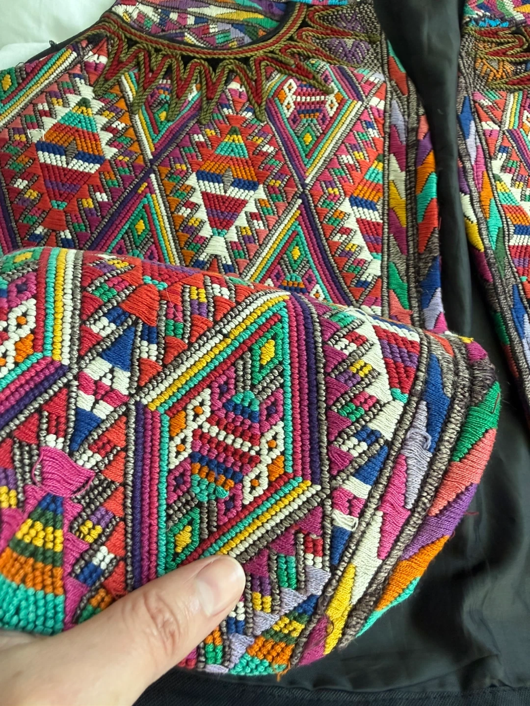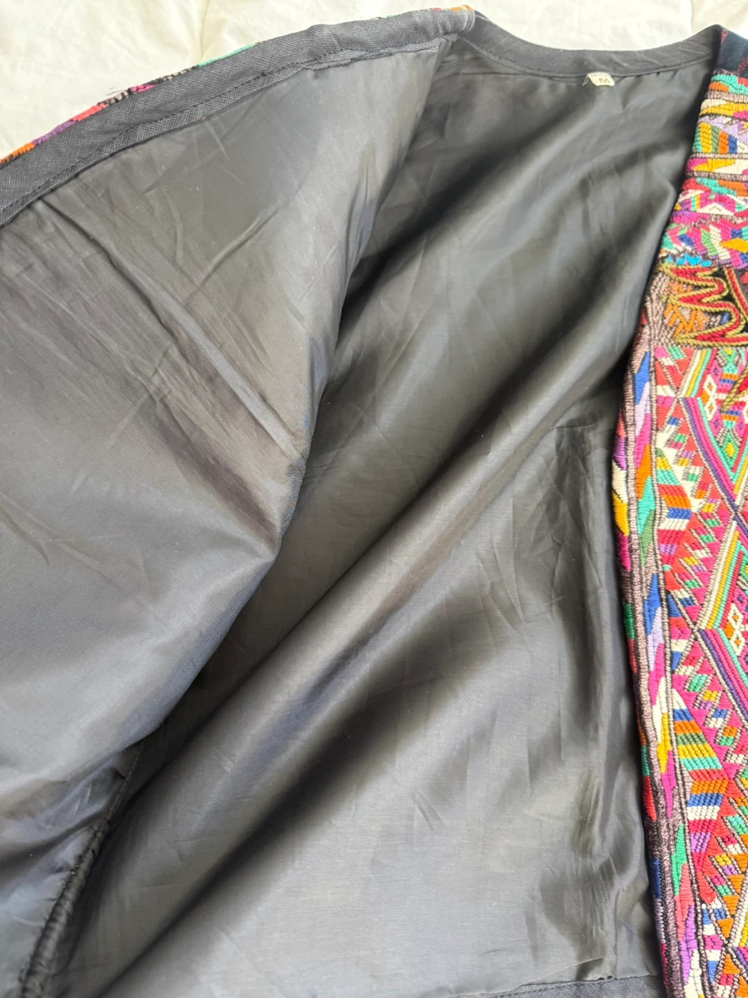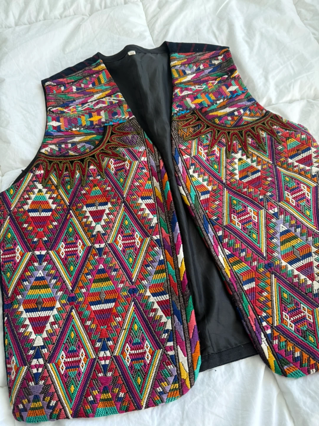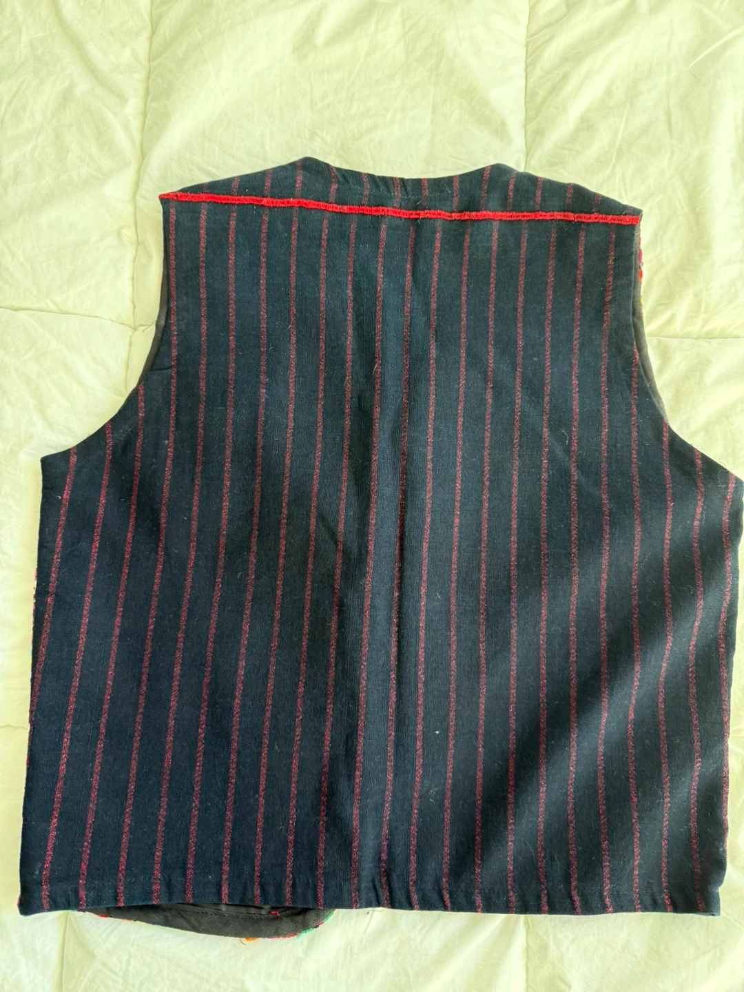 This vest features a dark navy base with red pinstripes. It's heavily embellished with colourful, geometric embroidery on the front panels and collar.