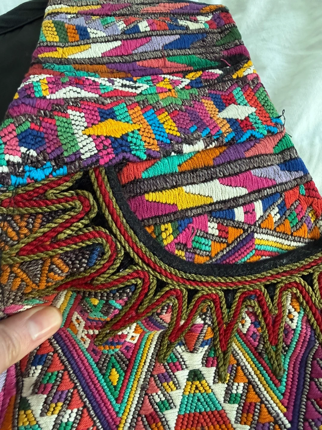 This vest features a dark navy base with red pinstripes. It's heavily embellished with colourful, geometric embroidery on the front panels and collar.