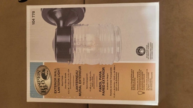 Selling a new Hampton Bay exterior wall lantern light. It has a sleek black finish and clear ribbed glass, perfect for adding a touch of elegance to your home's exterior. This lantern provides a classic look with modern durability. Dimensions: 11.43 cm x 16.82 cm. Finish: Black. Glass: Clear ribbed. If the ad's up, it's available! $10 or best offer. You must pick up.
