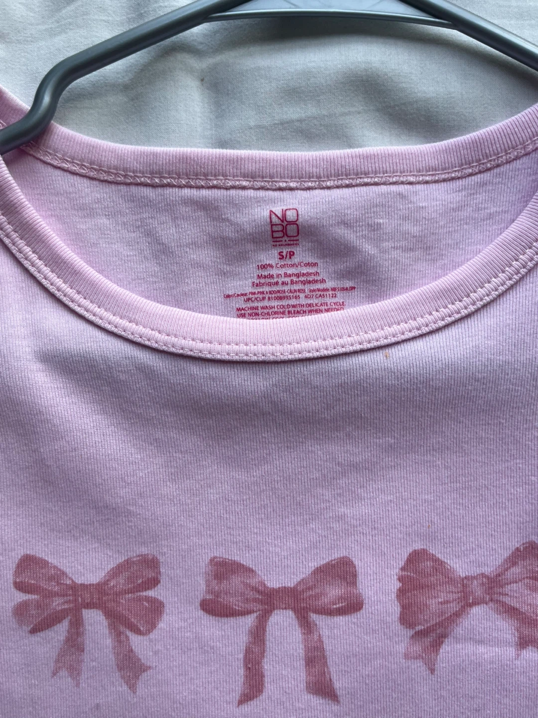 This No Boundaries t-shirt is a size S/P. It's made from 100% cotton and features a cute bow print.