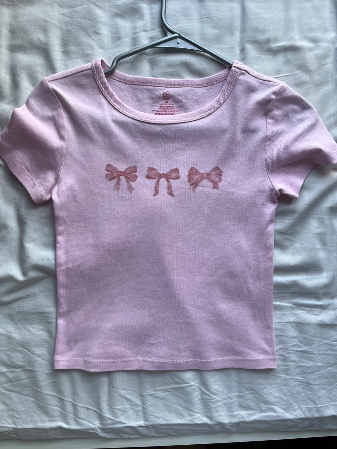 This No Boundaries t-shirt is a size S/P. It's made from 100% cotton and features a cute bow print.