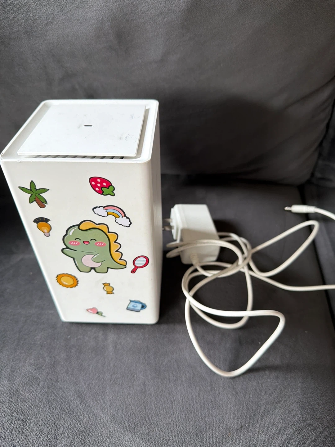 This is a white wireless router. It's decorated with cute stickers, including a dinosaur, strawberry, and rainbow. It comes with its power adapter and cord.
