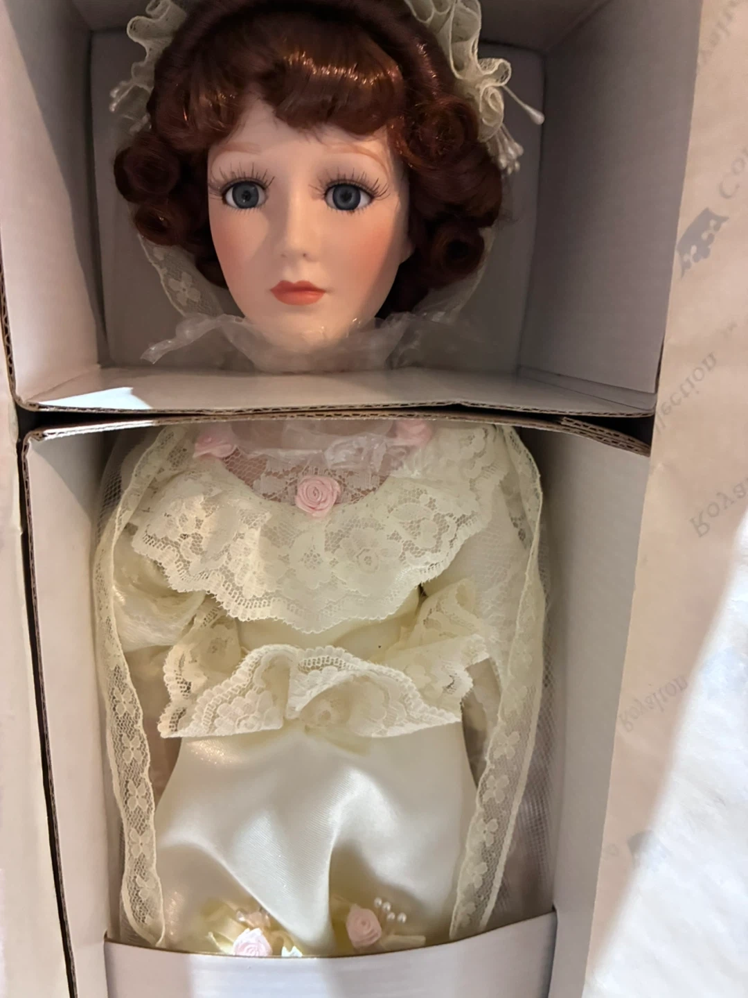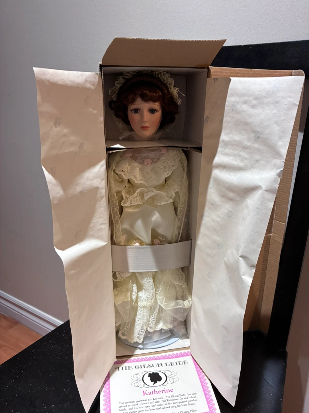 This Katherine doll is from The Gibson Bride collection. It's presented in its original box with protective packaging. The doll features a hand-painted porcelain head, hands, and feet, with clothing tailored using fine fabrics.
