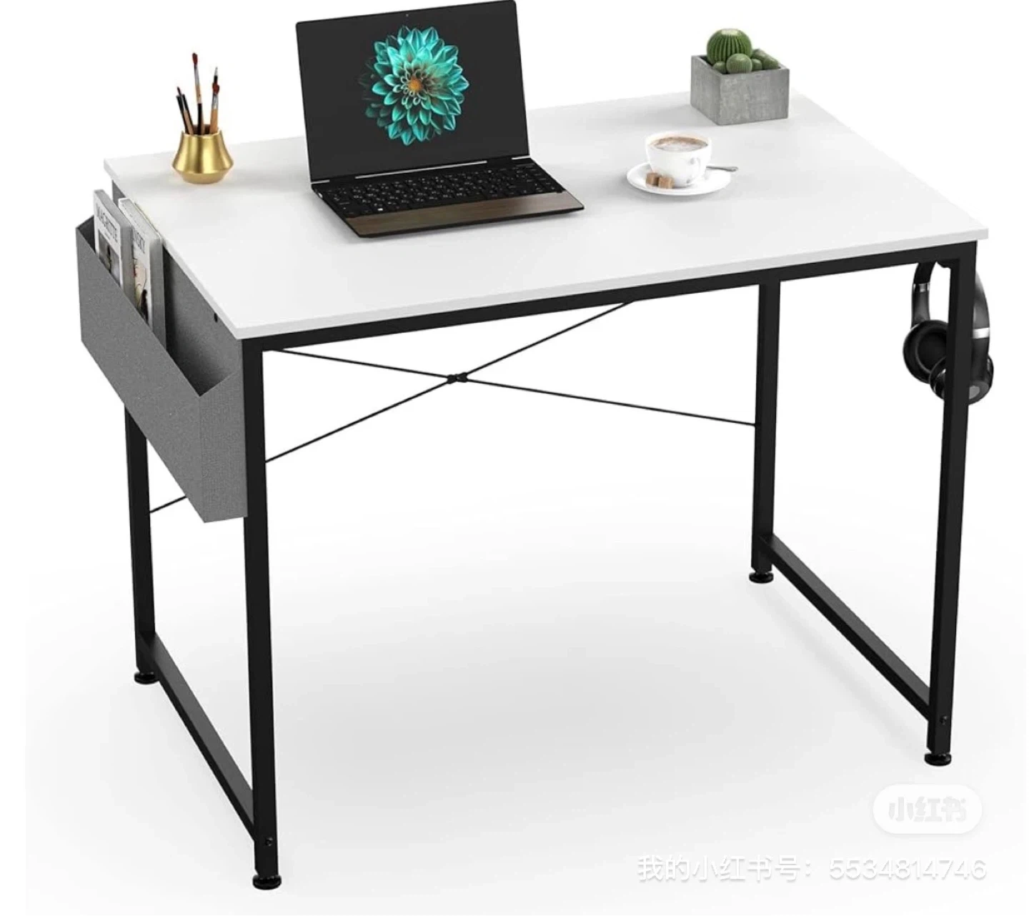 A simple computer desk with a white tabletop and black metal legs. It includes a grey fabric side organizer for storage. This desk is great for small spaces!