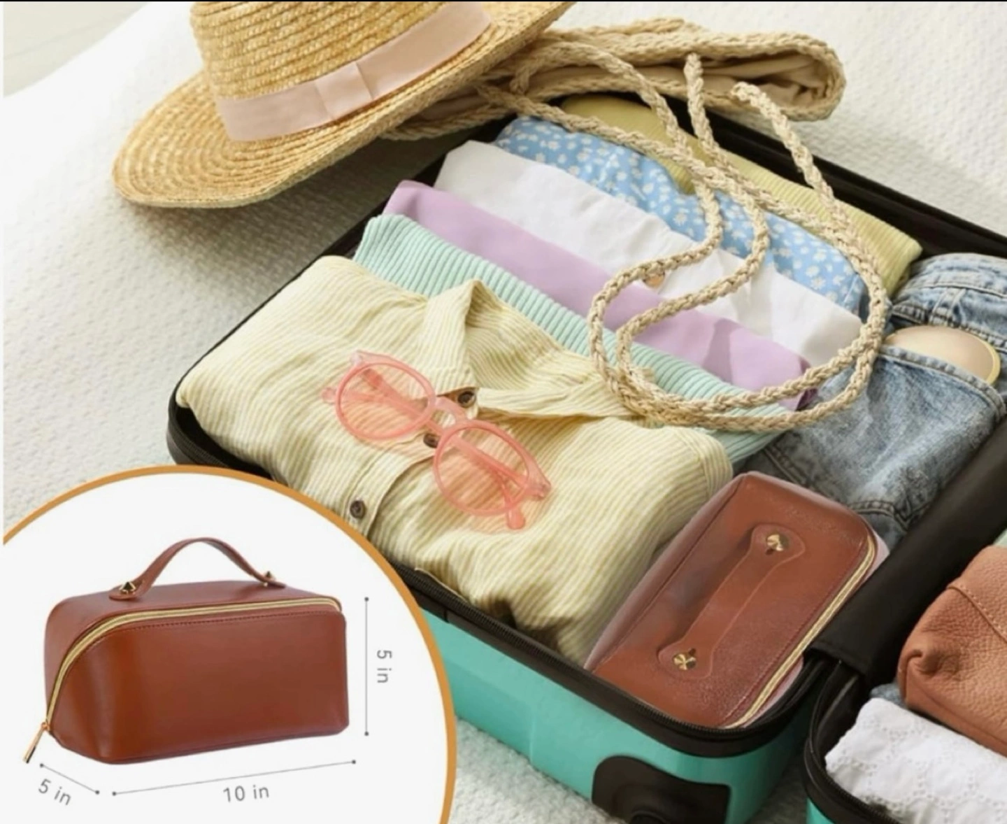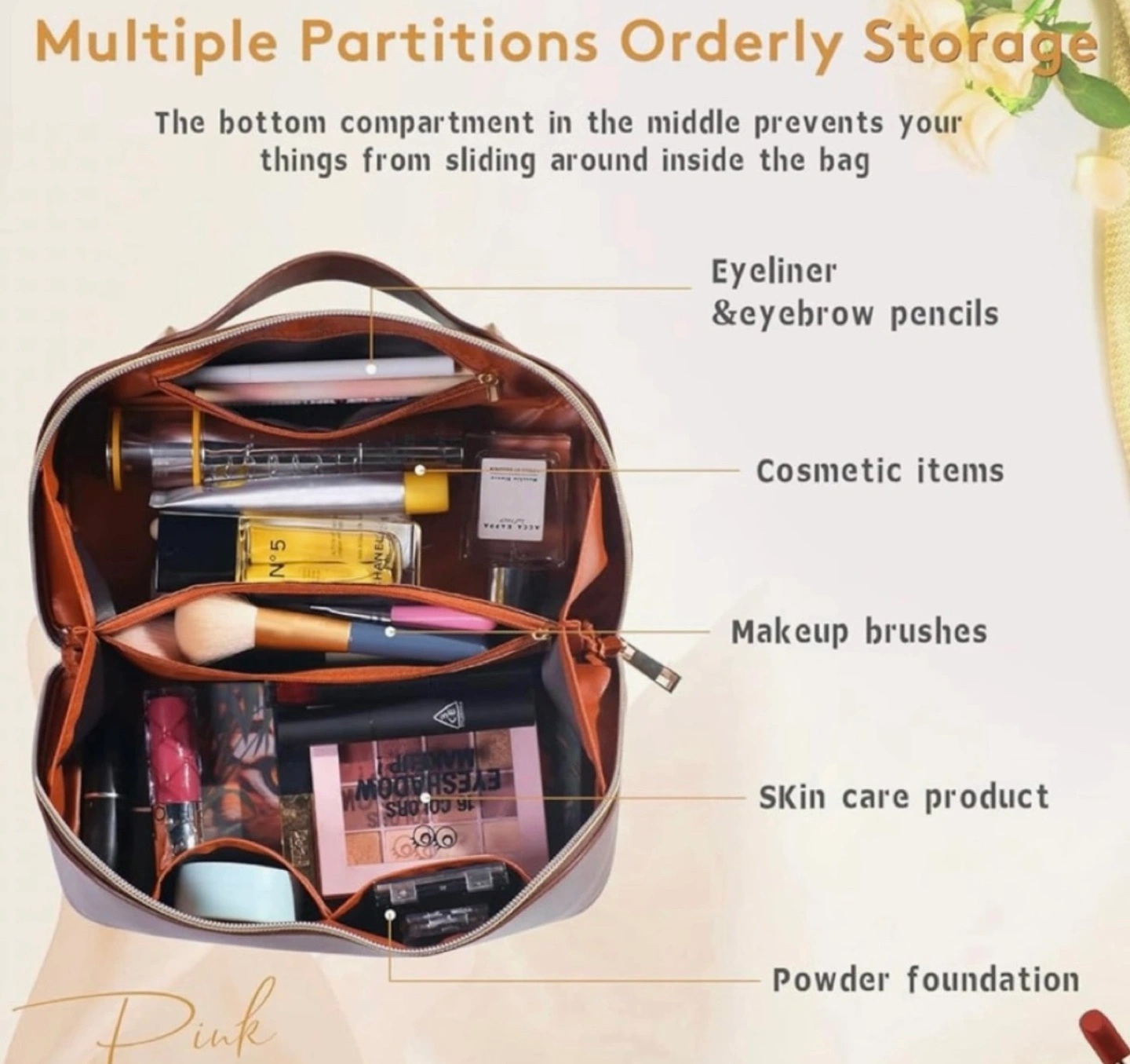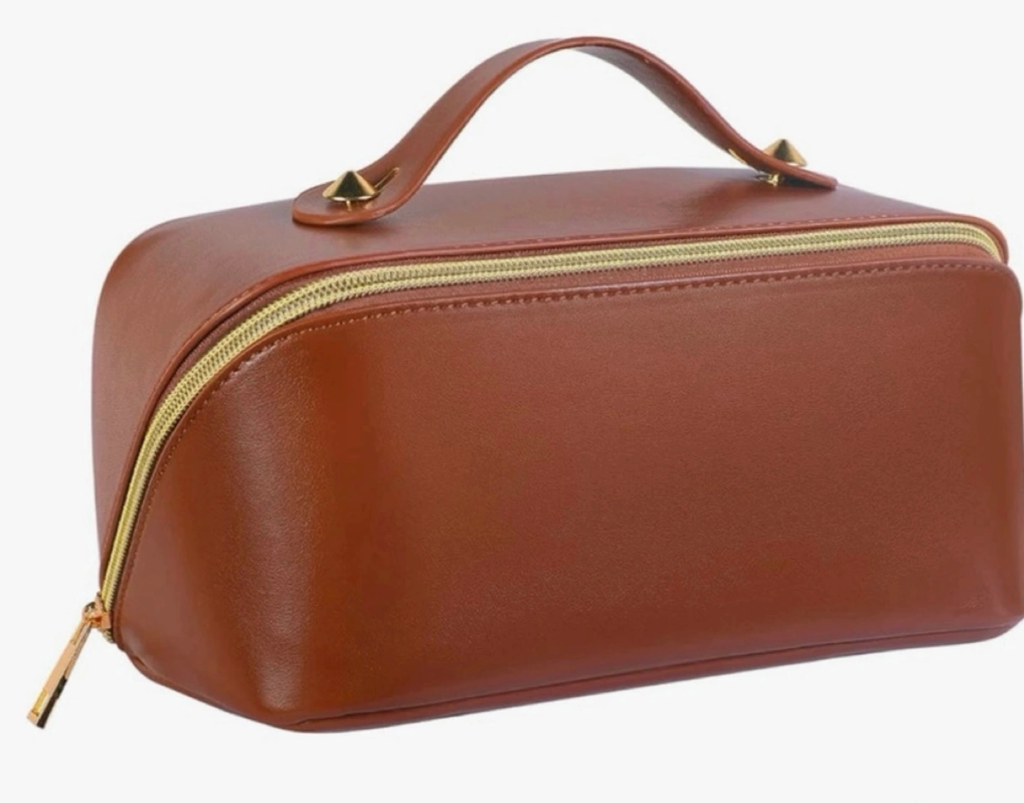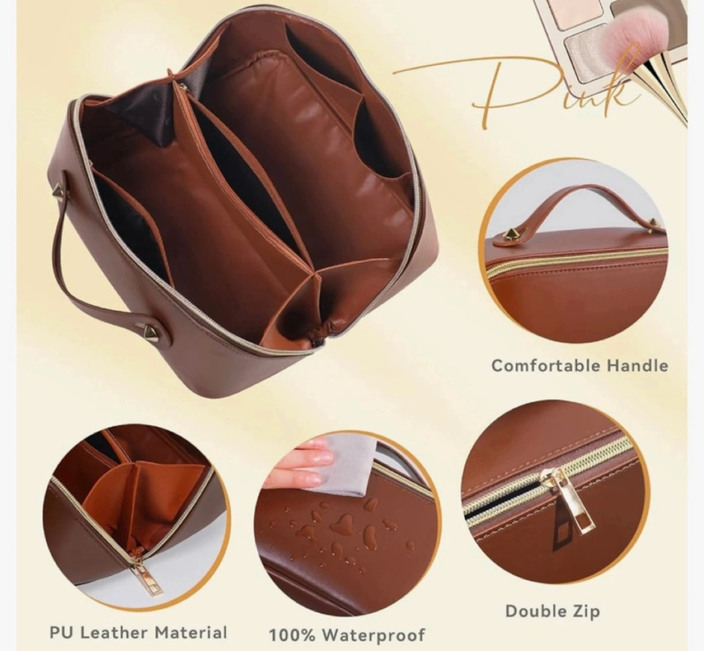 Travel makeup multifunctional cosmetic bag, brown PU leather