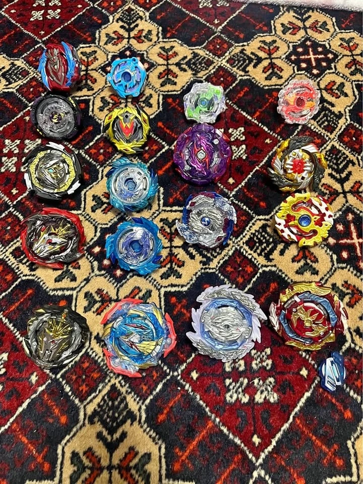 Awesome lot of Beyblades has 18 different ones. The first to 3d row is all takara tomy Beyblades ( real ) and the rest is hasbro. They all range around 30 to 100. For all of them 300. Cash. Pick up