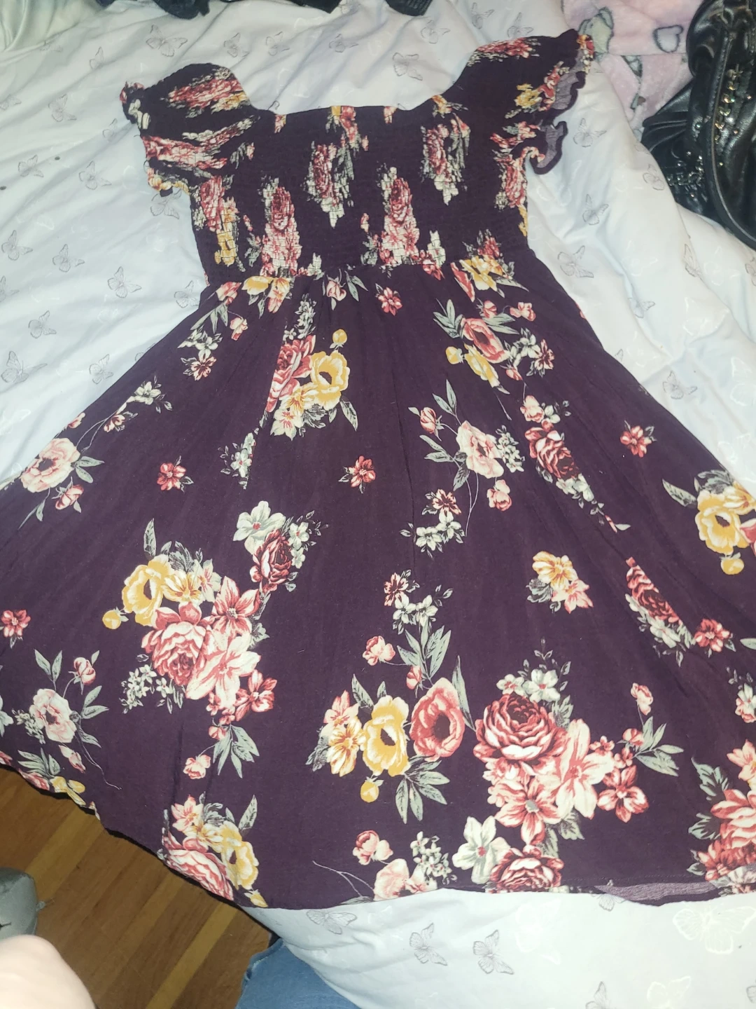 Pretty plum-coloured dress with a vibrant floral print all over. It features an off-the-shoulder neckline and short ruffled sleeves. This dress is made from a lightweight fabric, perfect for warmer weather.