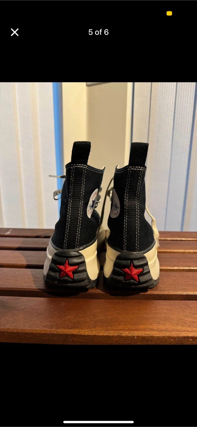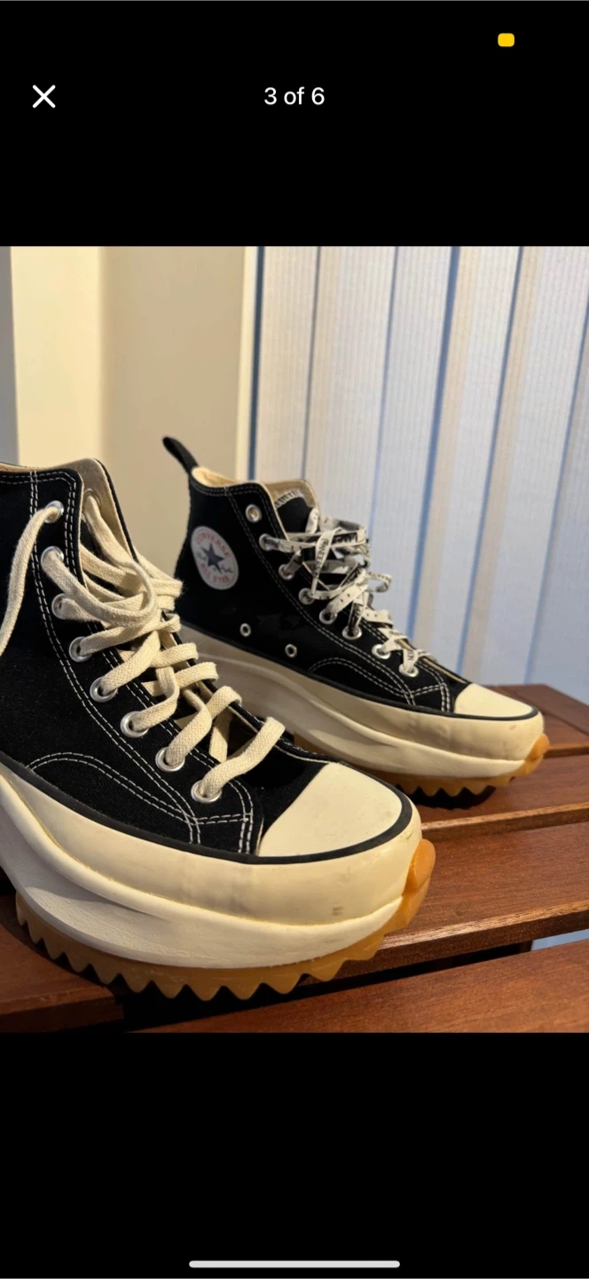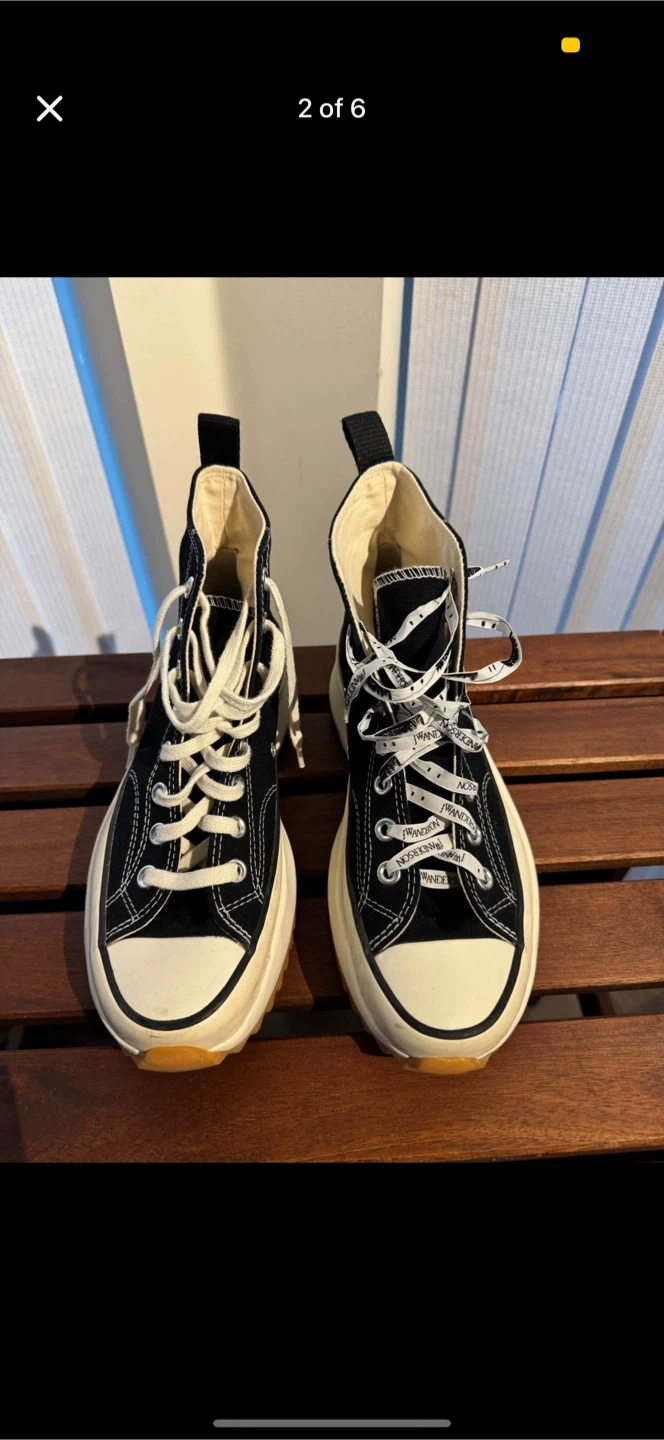 These Converse x JW Anderson Run Star Hike Hi sneakers are black canvas with a chunky platform sole. They feature white laces and the iconic Converse star logo. Great for adding a bold statement to any outfit!