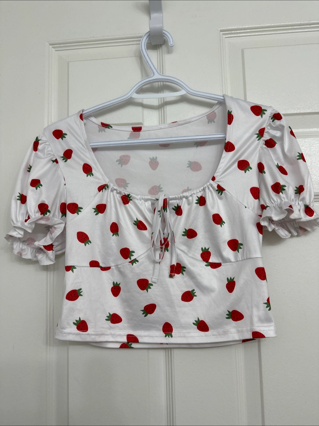 Cute strawberry print crop top in size M. It's made of 95% polyester and 5% spandex, so it's nice and stretchy! Machine wash cold