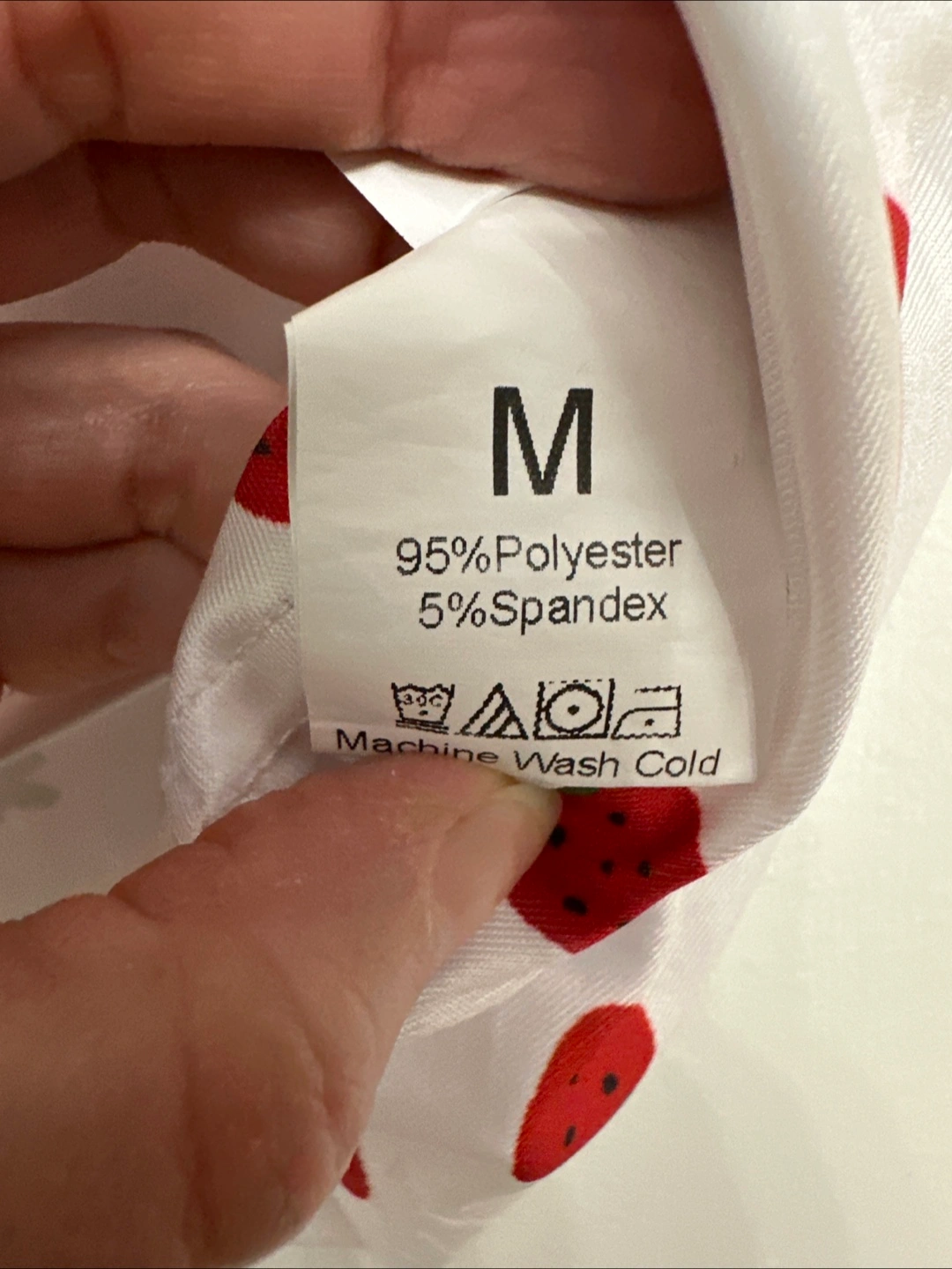 Cute strawberry print crop top in size M. It's made of 95% polyester and 5% spandex, so it's nice and stretchy! Machine wash cold