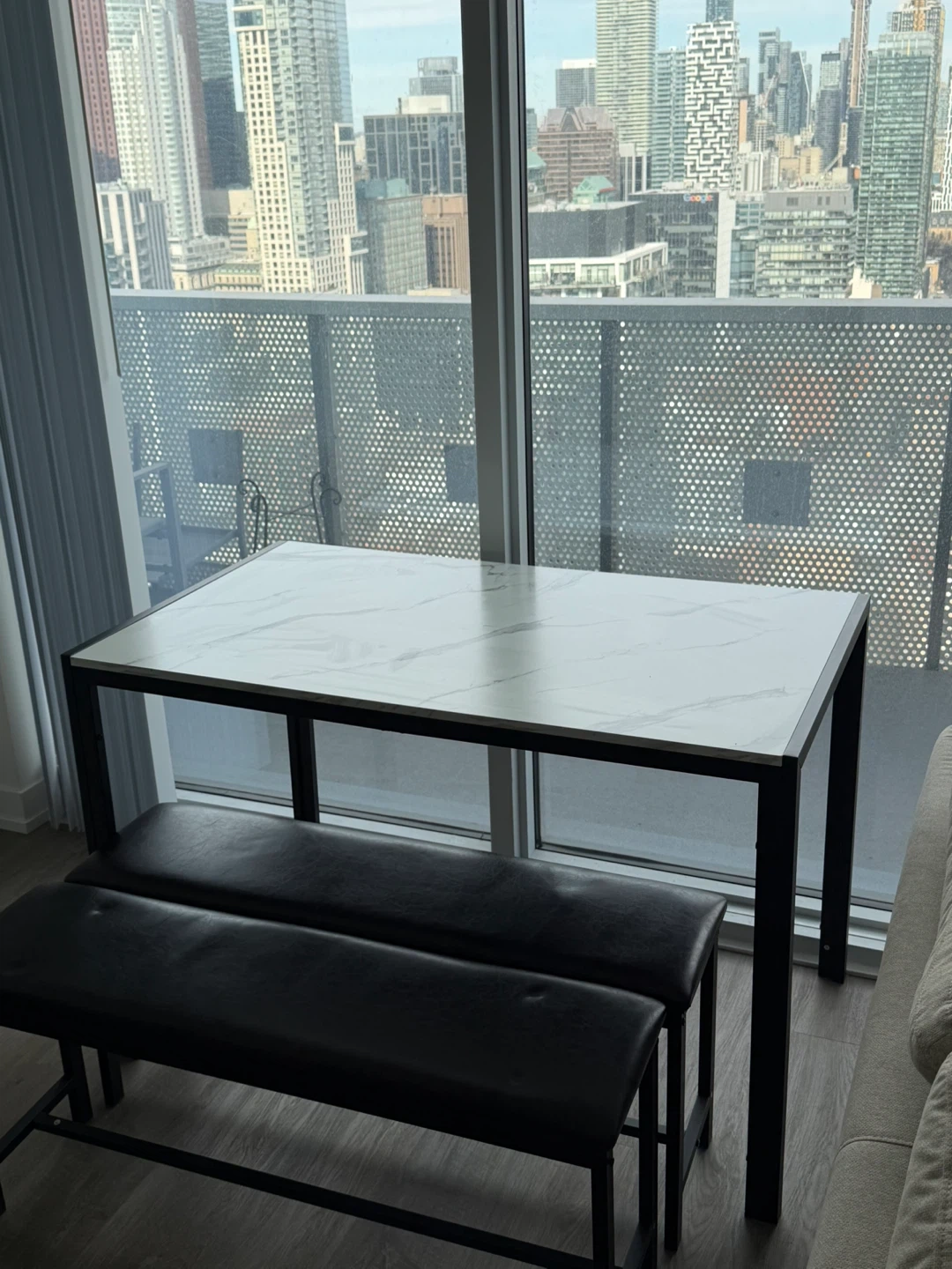 Includes a marble-look tabletop dining table with black metal legs and two dark brown upholstered benches. Perfect for smaller dining areas or kitchens.