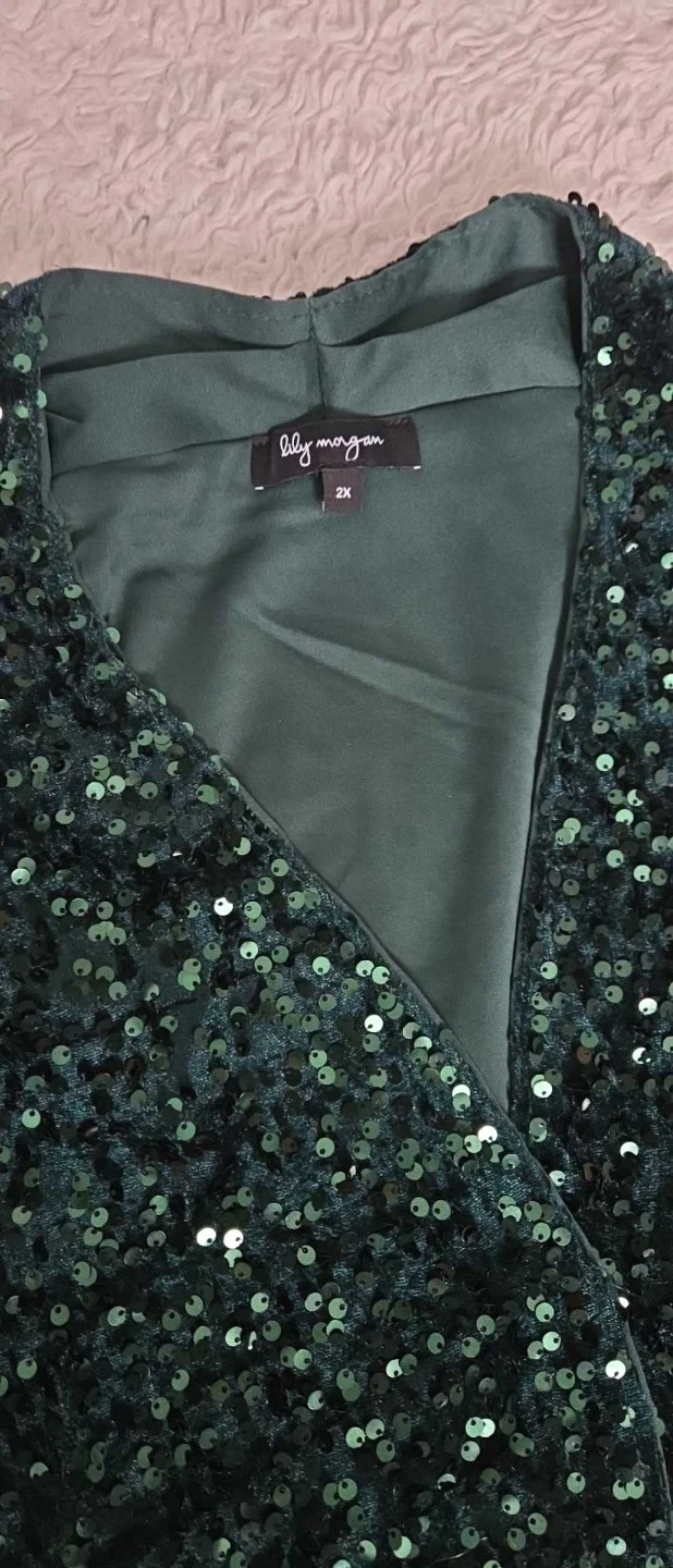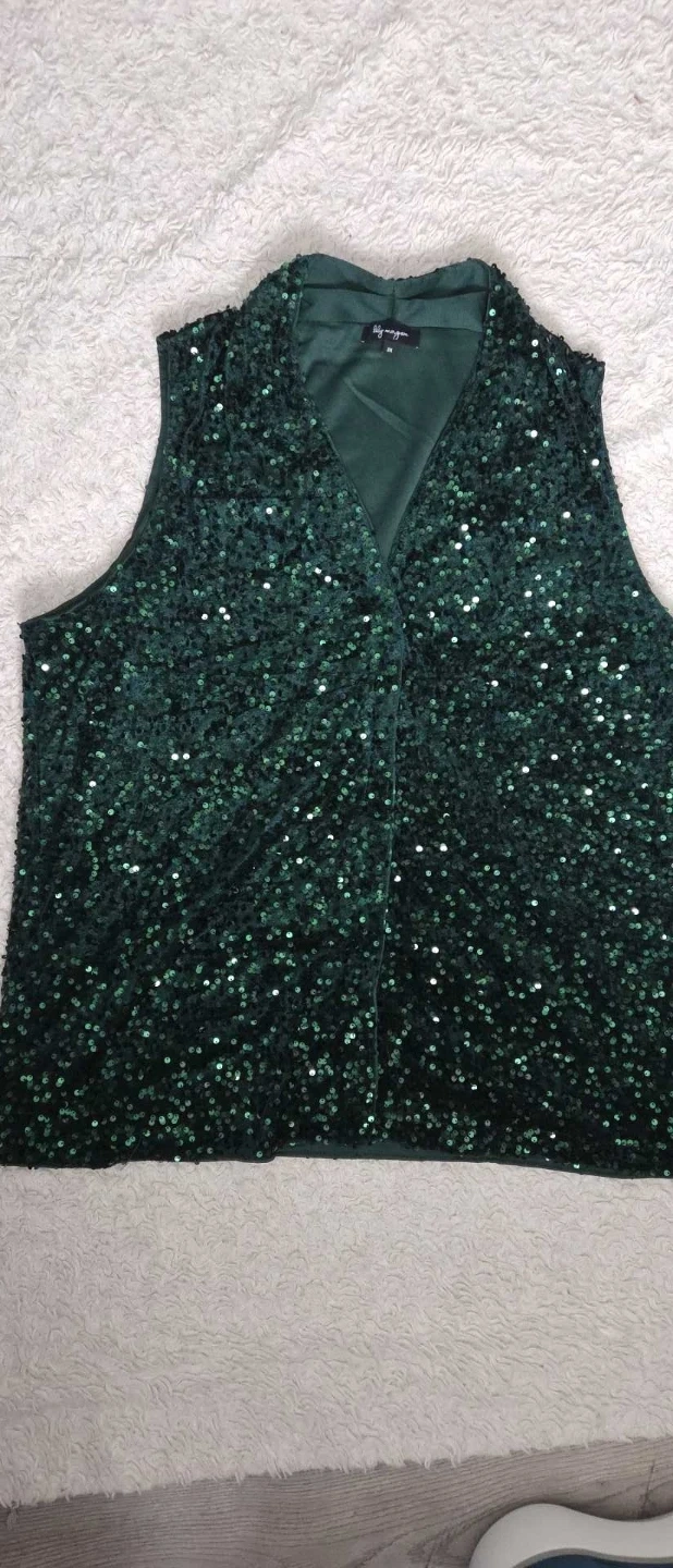 Sparkly green sequin vest from Lily Morgan. It's a size 2X and features a V-neckline. This vest is perfect for adding some flair to an outfit!