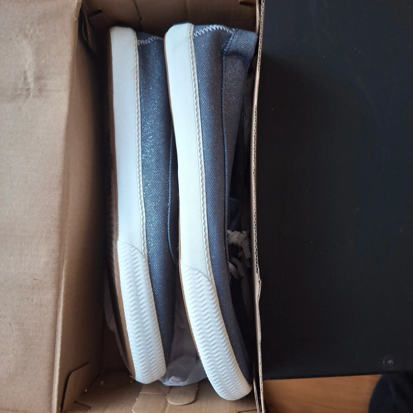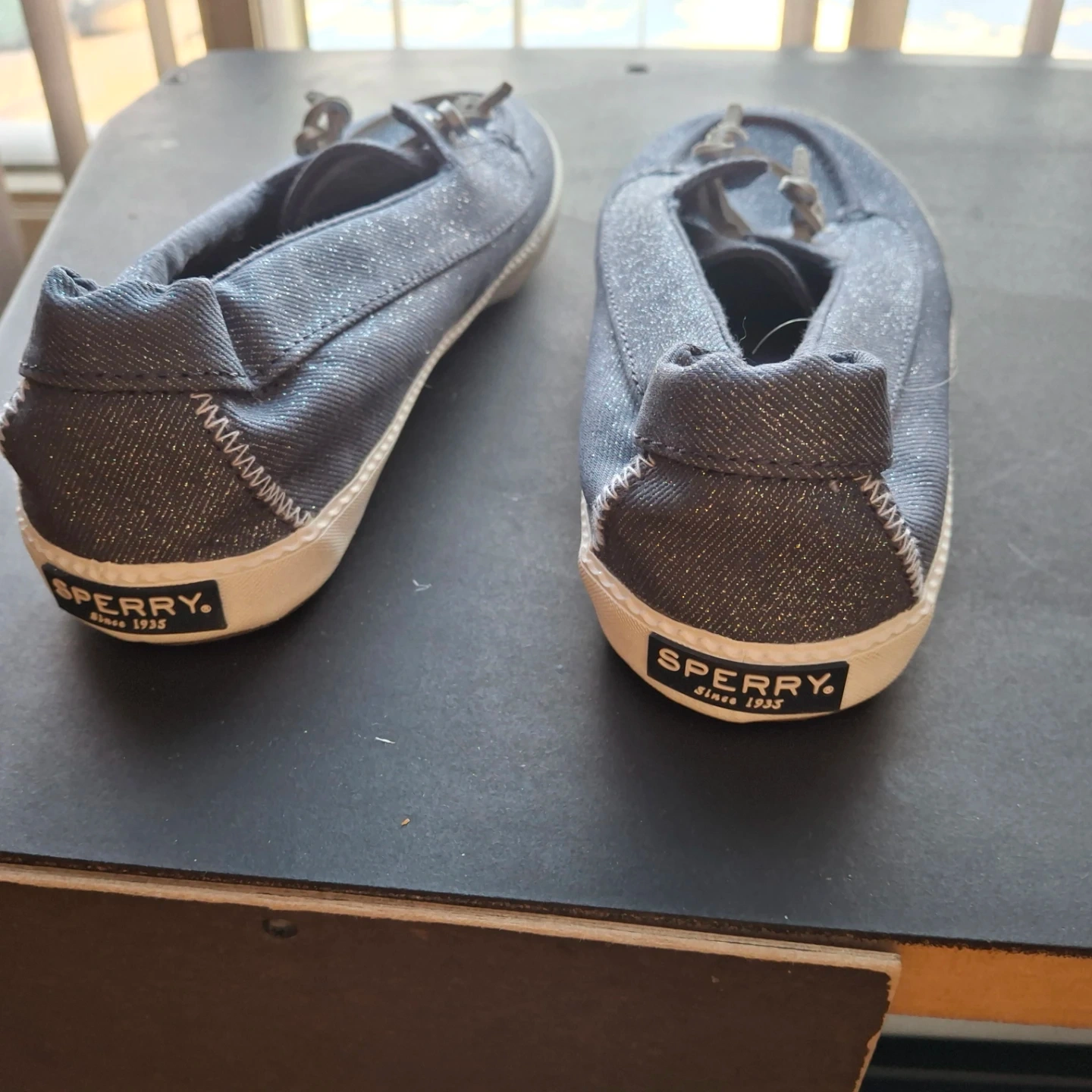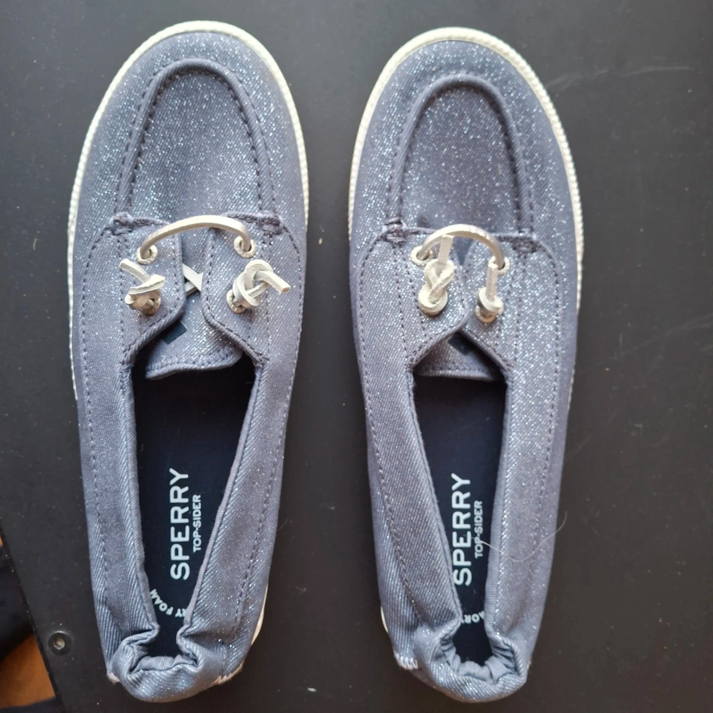 Sparkly blue denim boat shoes from Sperry Top-Sider. Comfortable slip-on style with rubber sole. Includes new in original box.