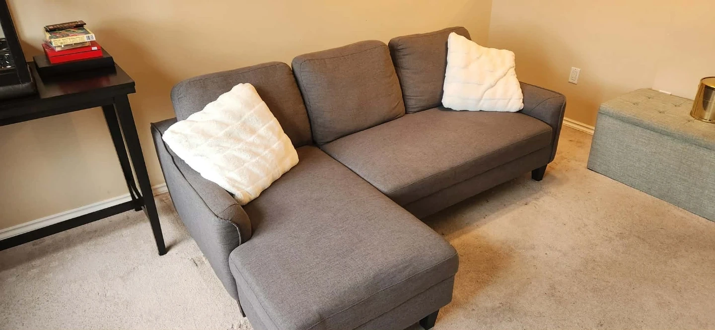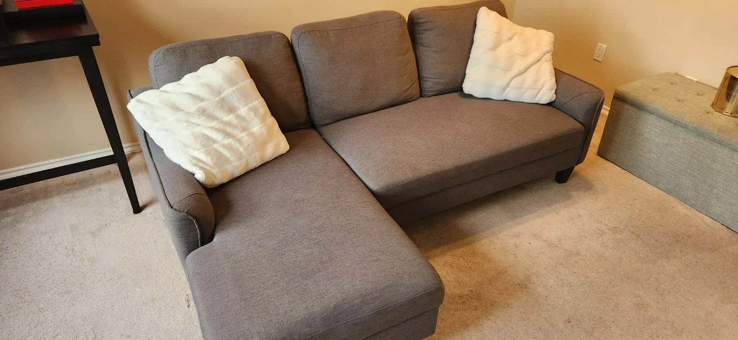 This is a comfortable grey sectional sofa that has the option to pull out. Used for about a year and a half, still in good condition. It's made with durable fabric and includes two white throw pillows. This sofa offers versatile seating options for your living space. Fits well inside apartment.