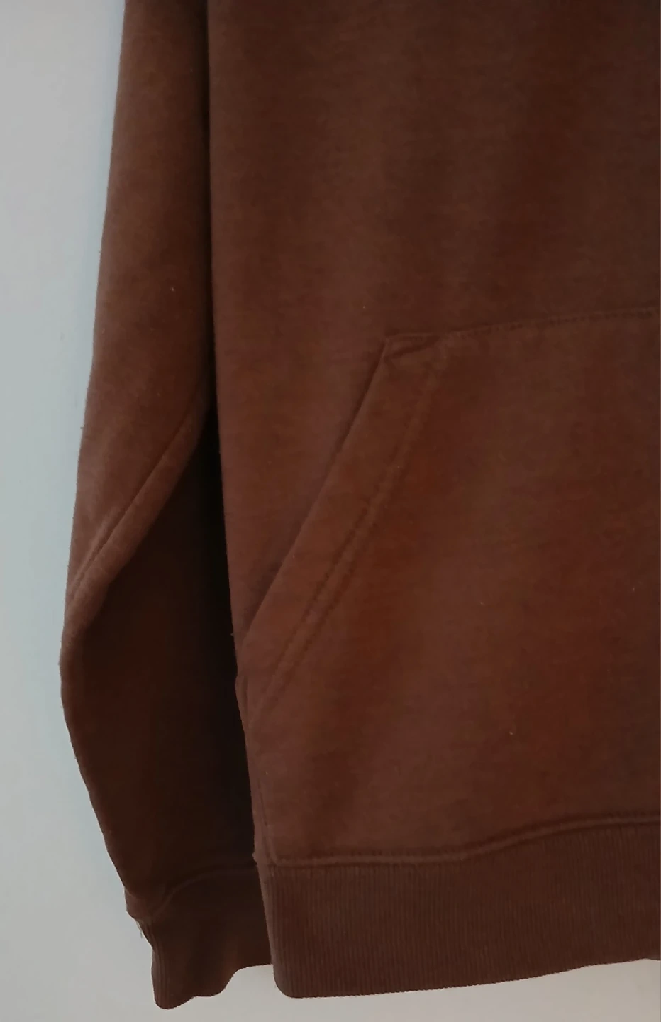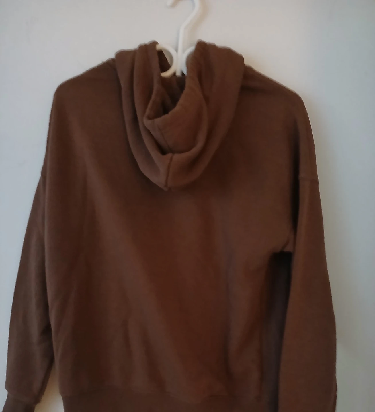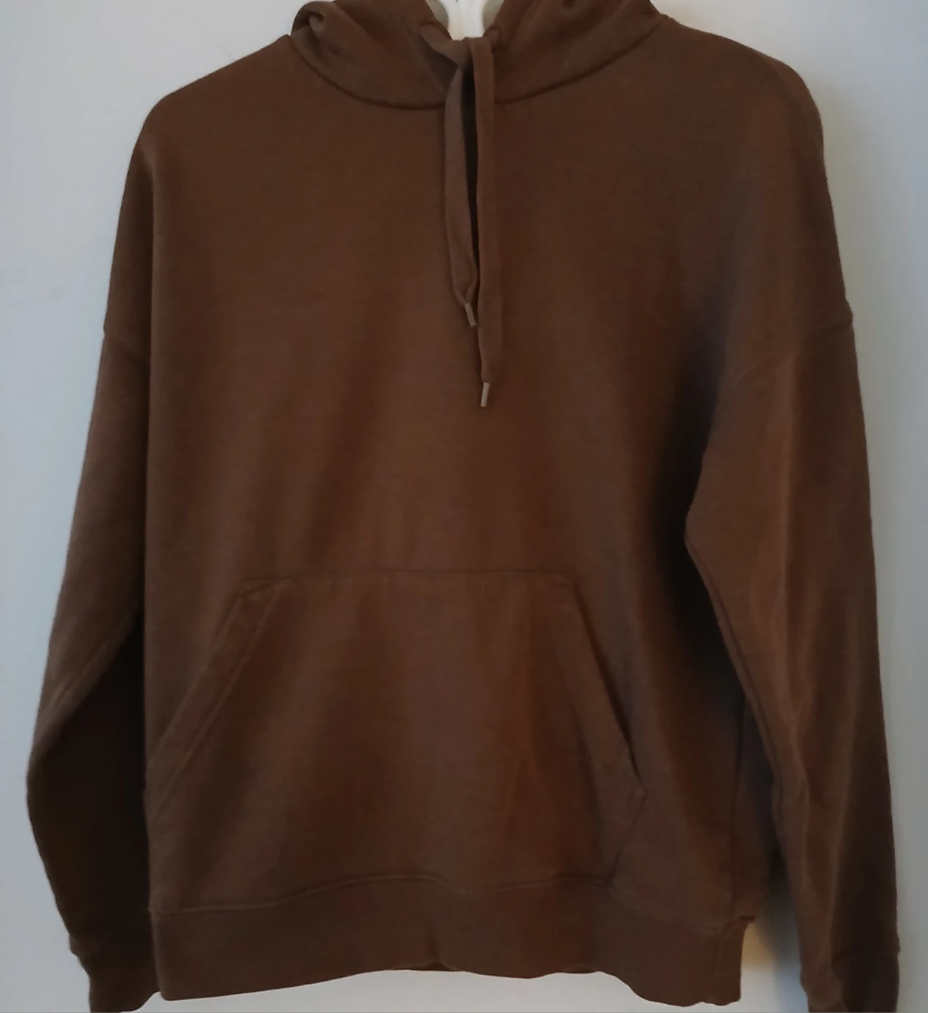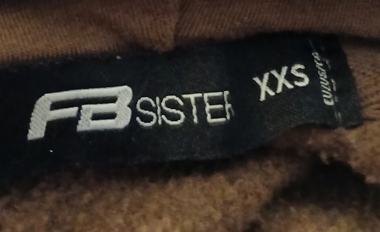 This is an FB Sister hoodie in a size XXS. It's a nice brown colour with a front pocket and drawstrings for the hood. It's made from a soft material, perfect for everyday wear.