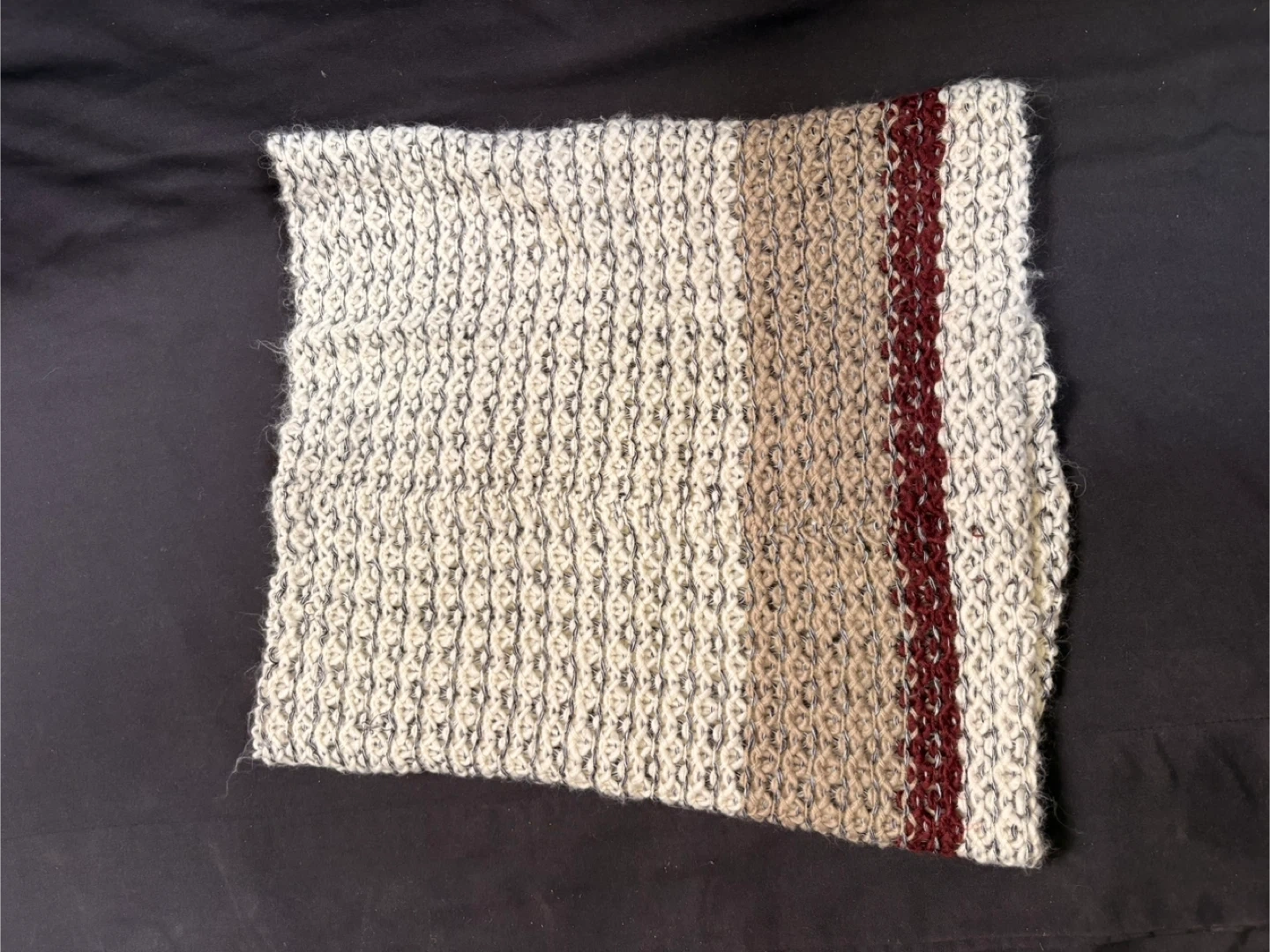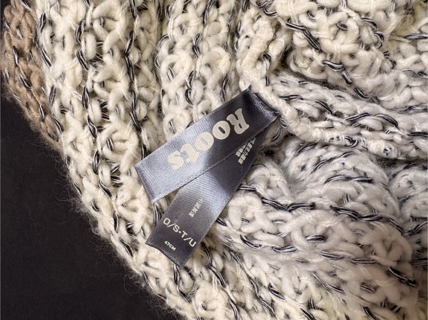 A warm, chunky knit infinity scarf from Roots. It features a mottled cream and grey yarn with maroon and black accents. One size fits all, perfect for cooler weather!