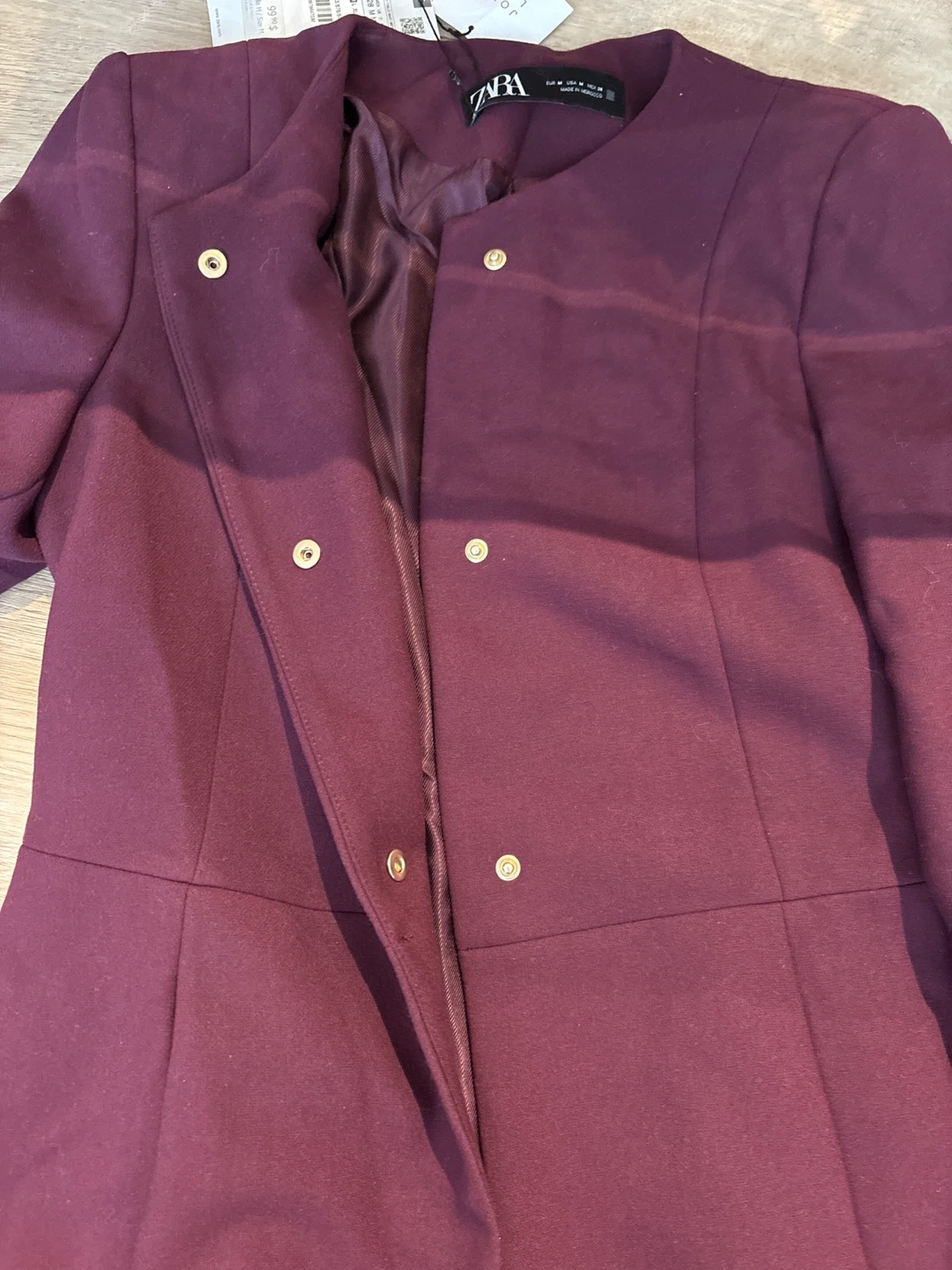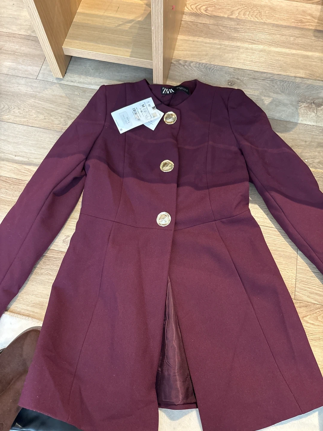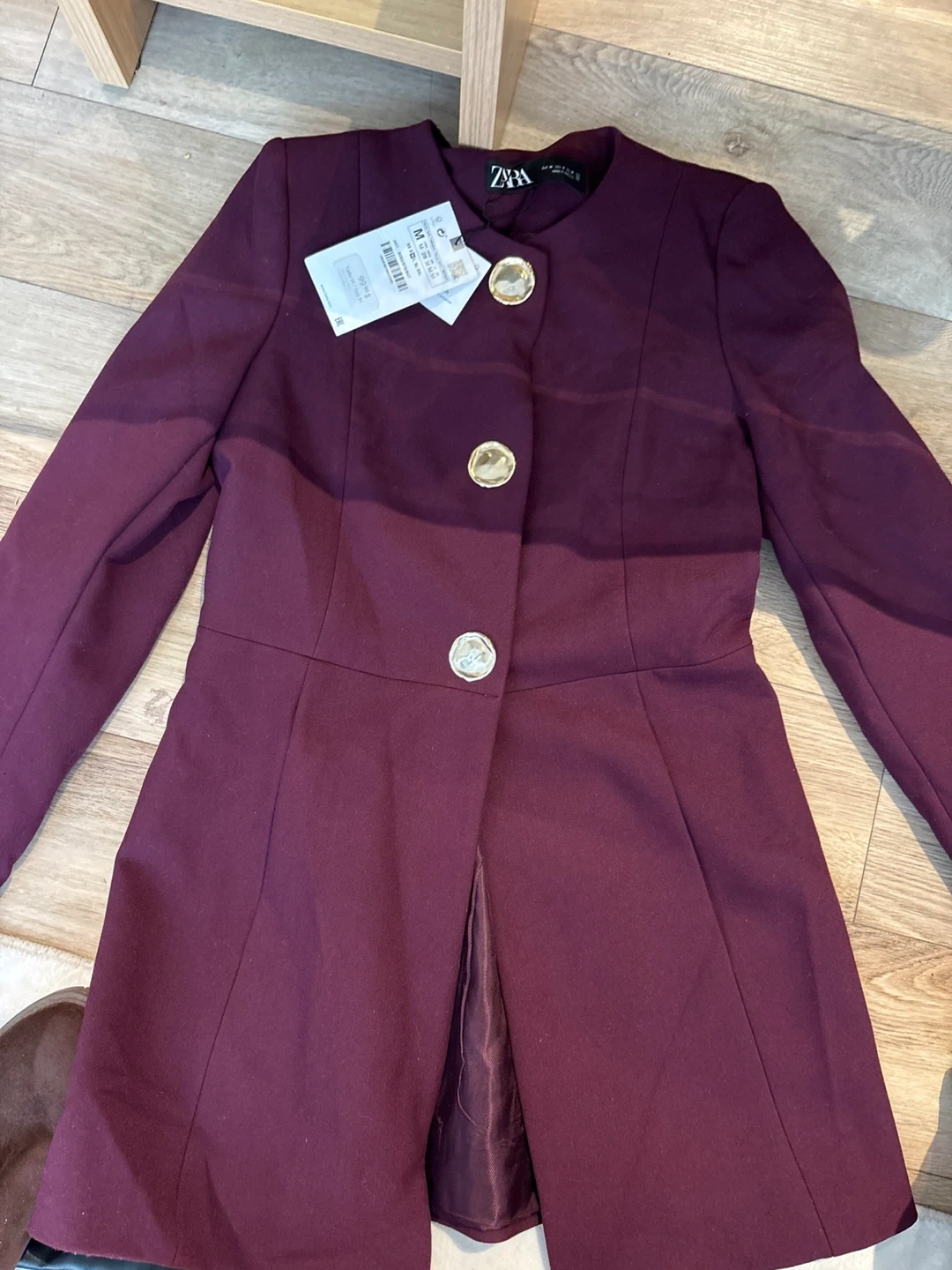 A stylish ZARA blazer in a deep burgundy colour. It features a classic cut with three large gold-tone buttons for closure. Size is medium. Perfect for dressing up an outfit!