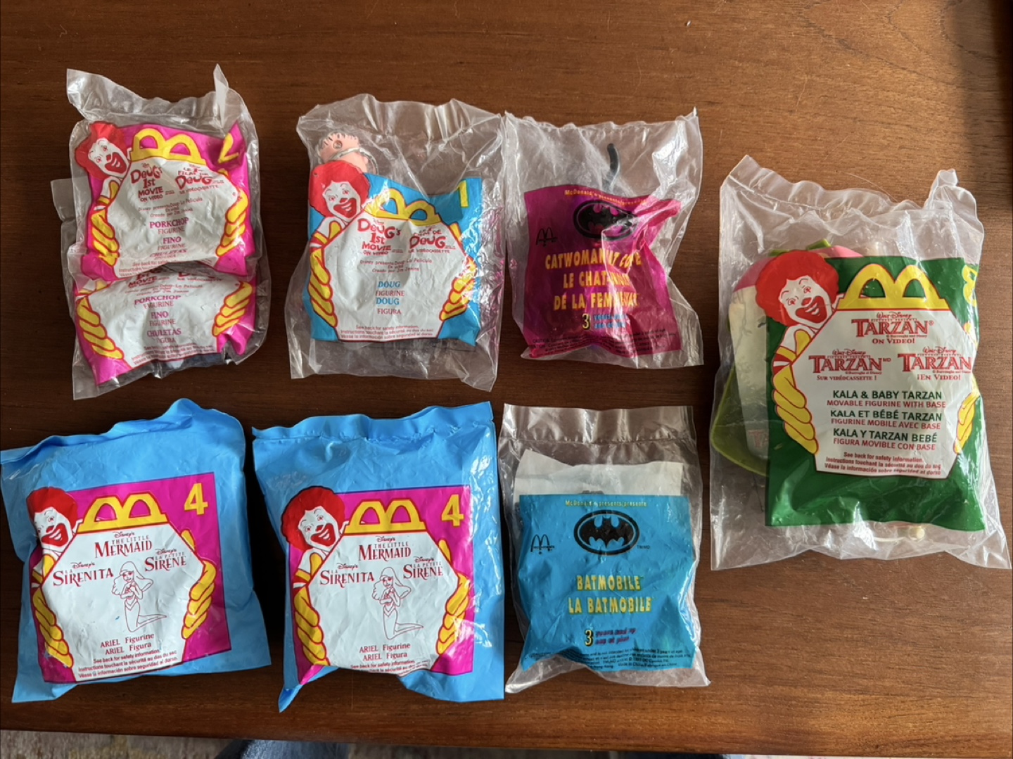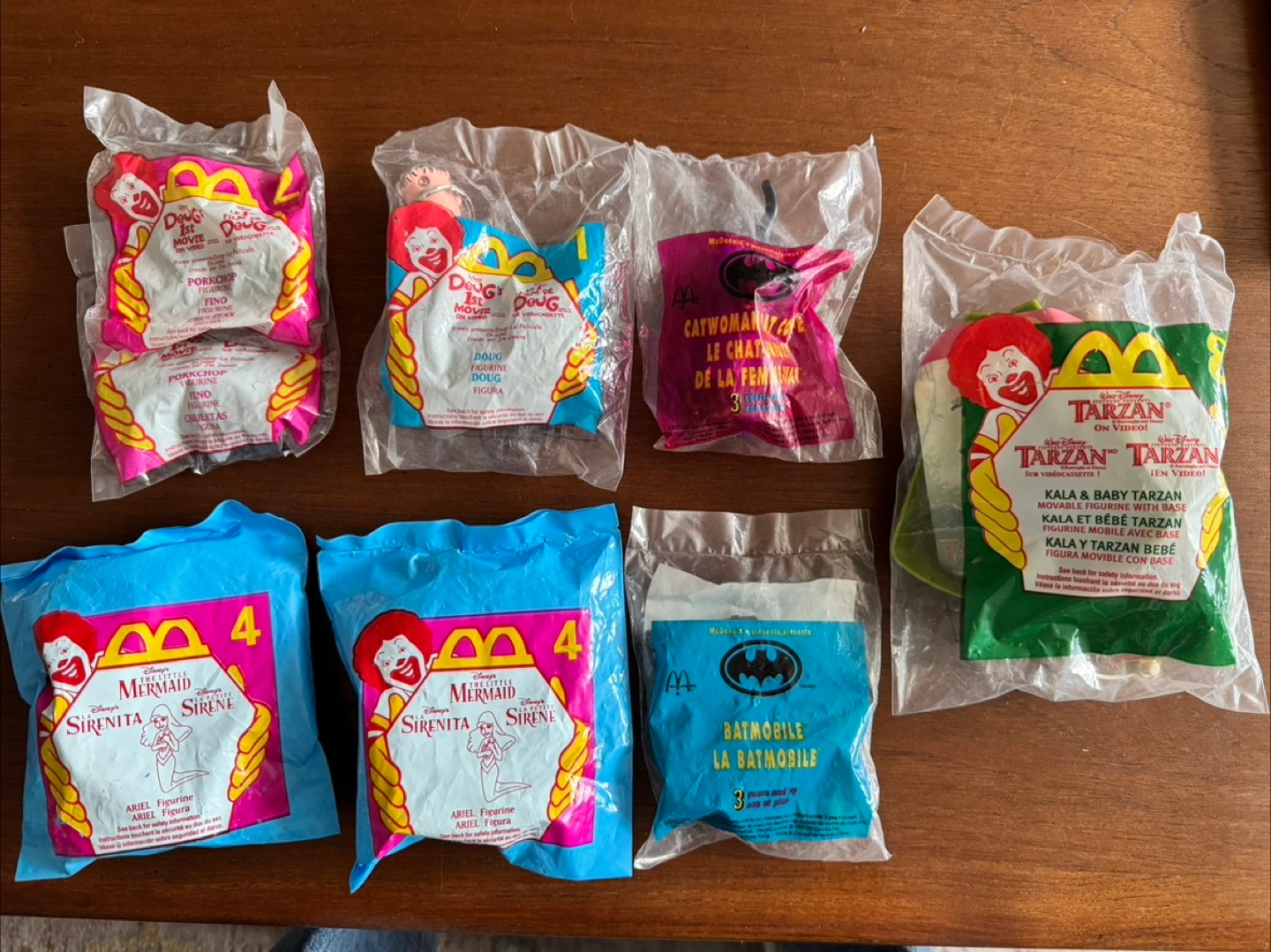 Lot of vintage McDonald's Happy Meal toys. Includes characters from *Doug*, *Batman*, *Tarzan*, and *The Little Mermaid*. Figures are in sealed packaging.